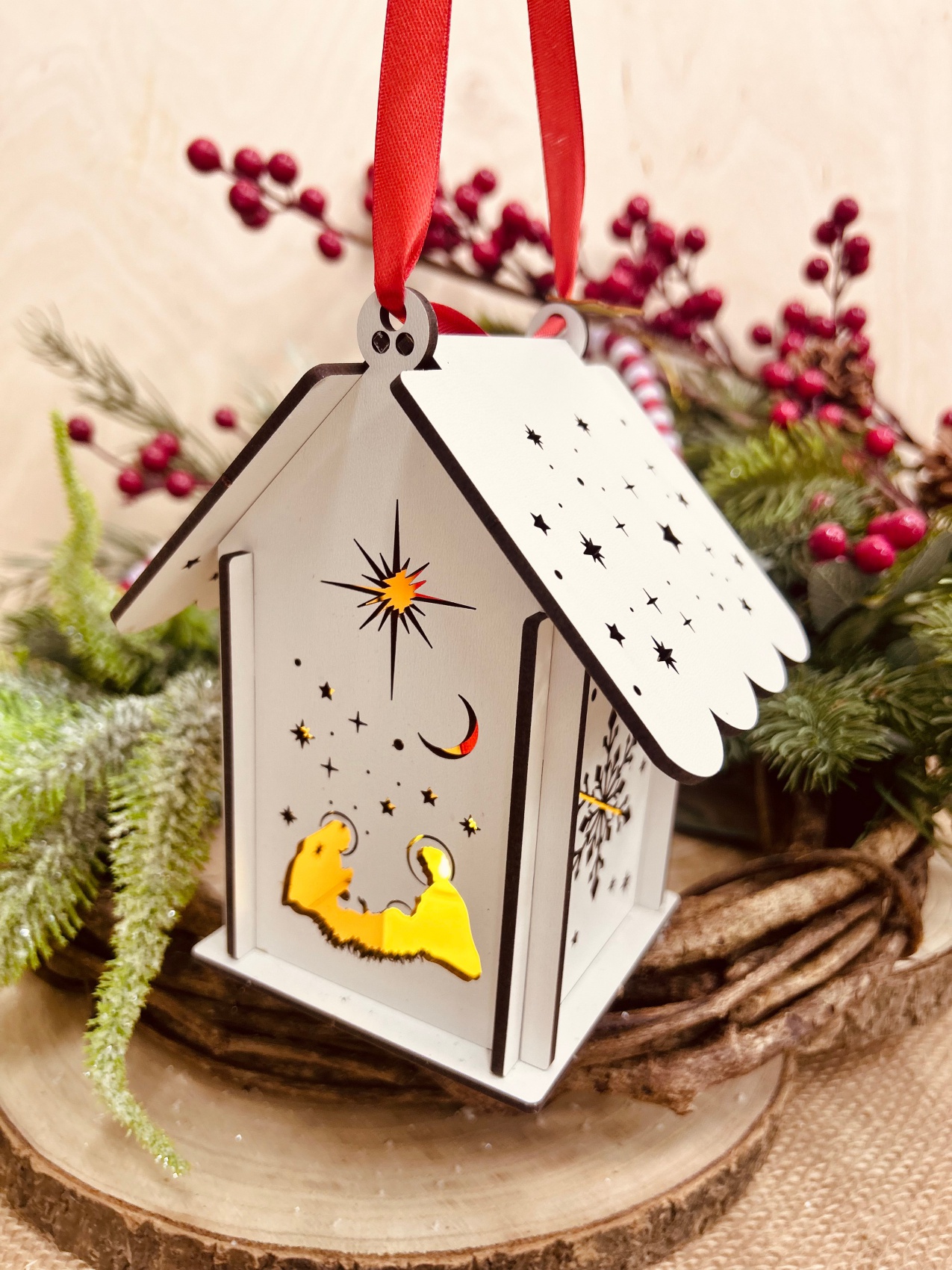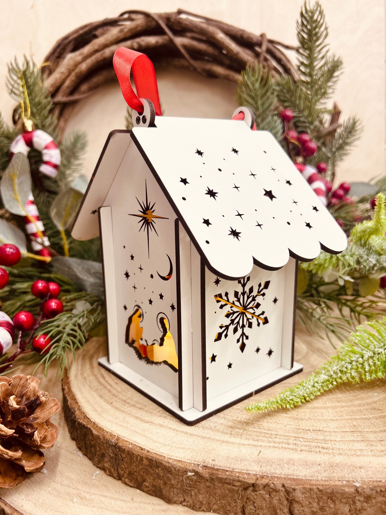 Na ściankach wycięte są imitacje świąteczne, które rozpraszają światło. Lampion stanowi świetną ozdobę świąteczną.