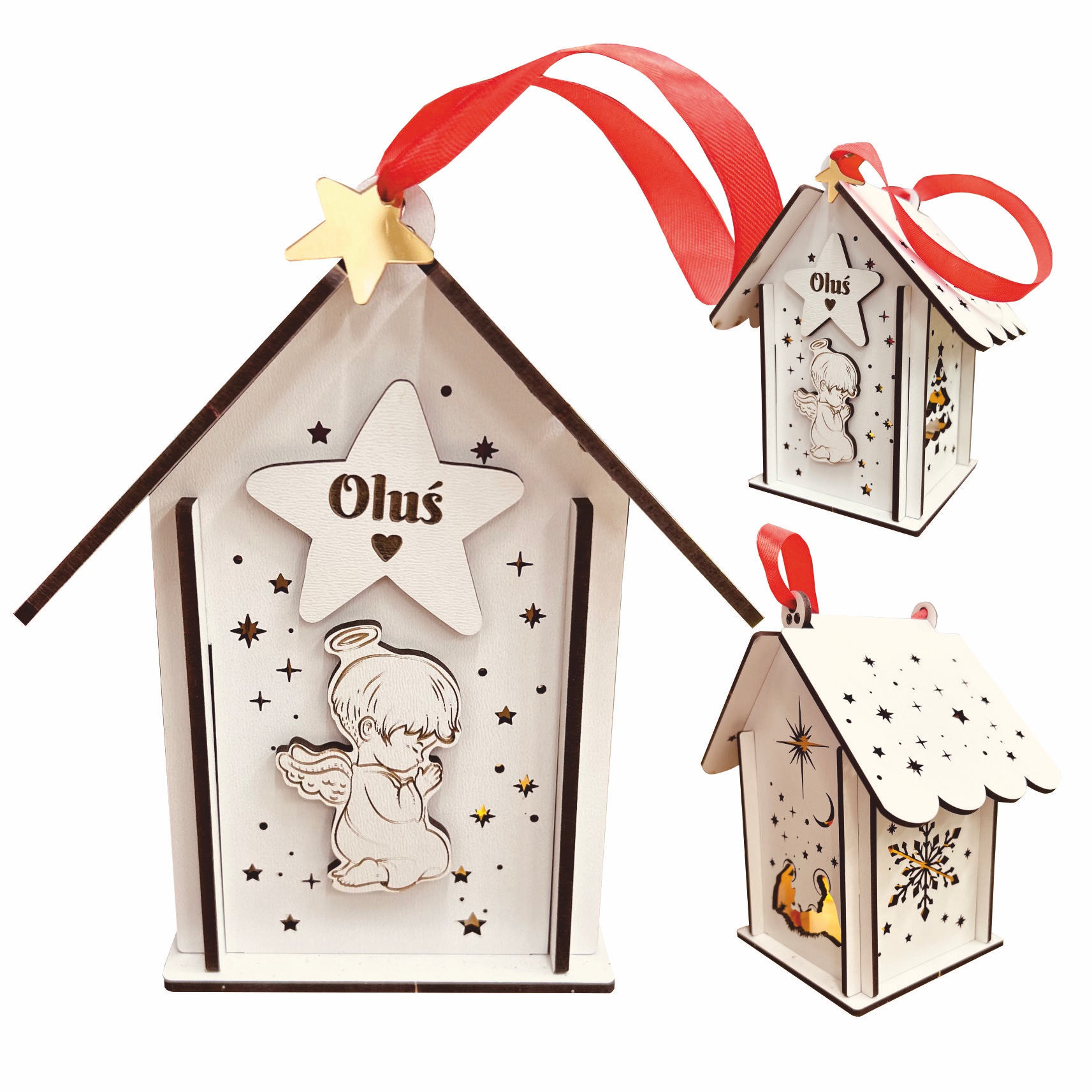 Lampion posiada subtelne, wycięte świąteczne wzory na ściankach, które pięknie rozpraszają światło, tworząc przytulną atmosferę w każdym pomieszczeniu. Można go ustawić na stole, oknie czy też w kącie pokoju, gdzie będzie pełnił rolę eleganckiej ozdoby. Zestaw zawiera lampkę LED, która jest bezpieczna i energooszczędna, zapewniając jednocześnie przyjemne, ciepłe światło. Dodatkowo, lampion ozdobiony jest wstążką w kolorze czerwonym z uroczą złotą przywieszką w kształcie gwiazdki, która doskonale wpisuje się w świąteczny klimat.