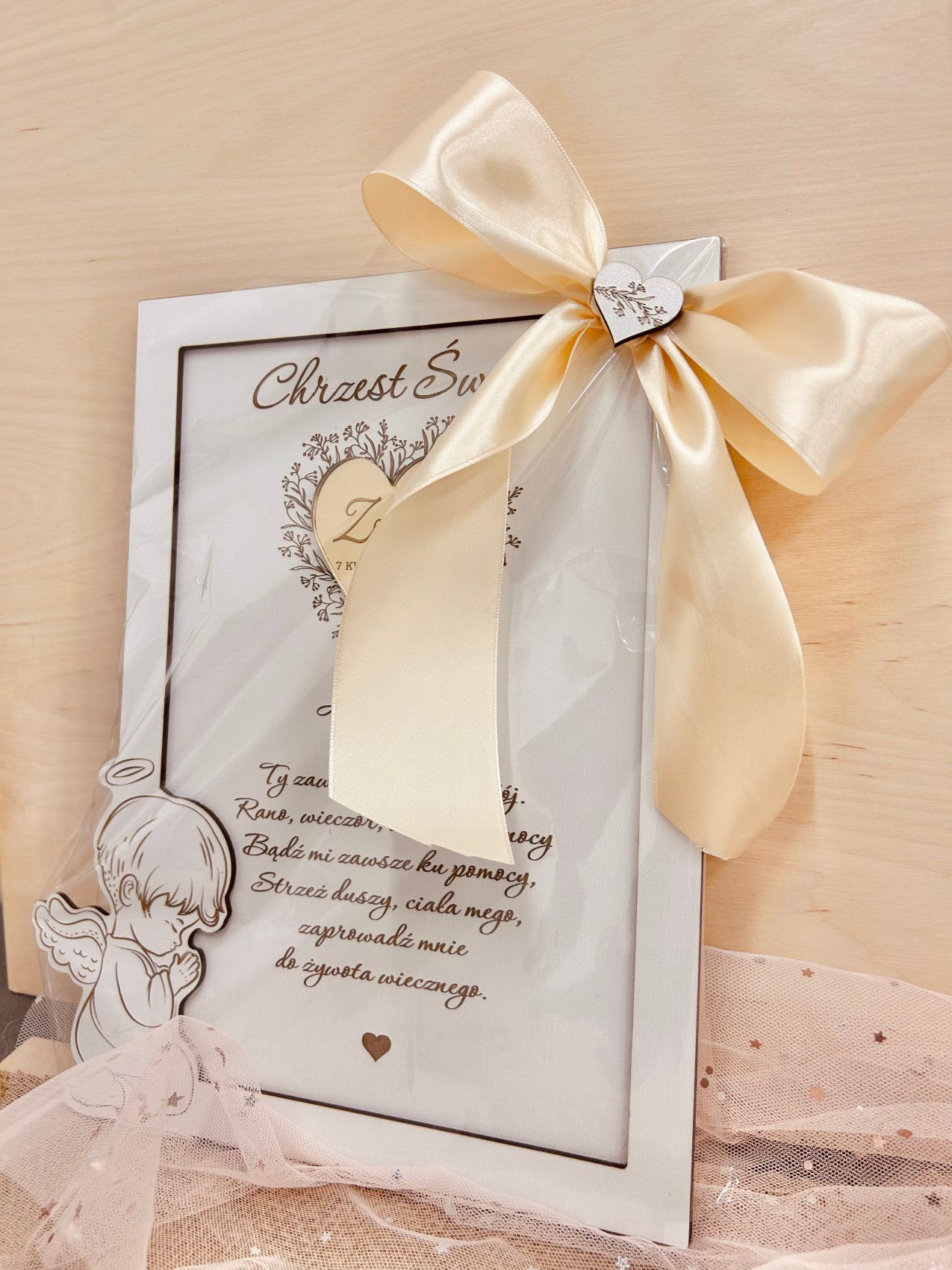 Pamiątka Chrztu Świętego jest dostępna na indywidualne zamówienie, co oznacza, że każdy produkt jest unikalny i dostosowany do życzeń zamawiającego. Wystarczy podać imię dziecka, np. „Maja”, oraz datę uroczystości, np. „10 Czerwiec 2024 r.” – te informacje zostaną precyzyjnie naniesione na pamiątkę, tworząc osobisty i pełen emocji upominek.