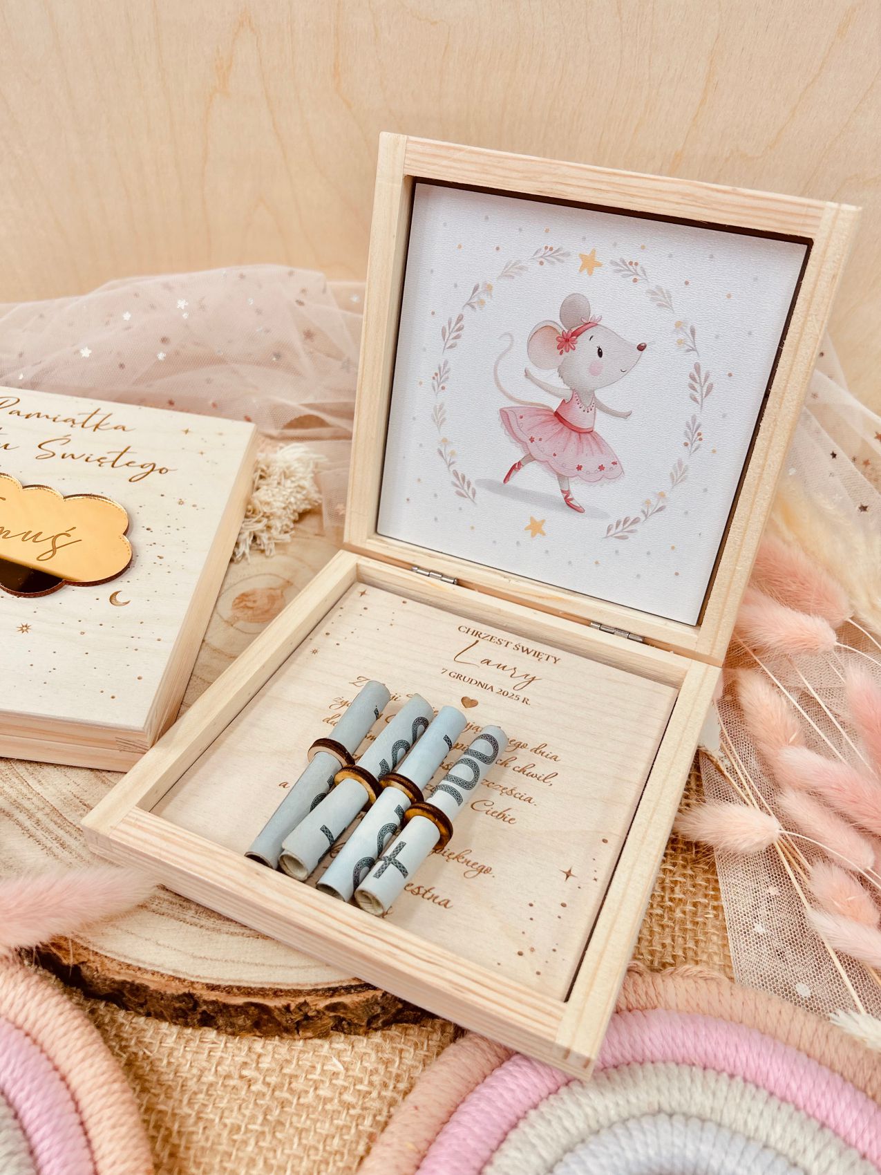 Drewniane pudełko myszka – pamiątka Chrztu Świętego