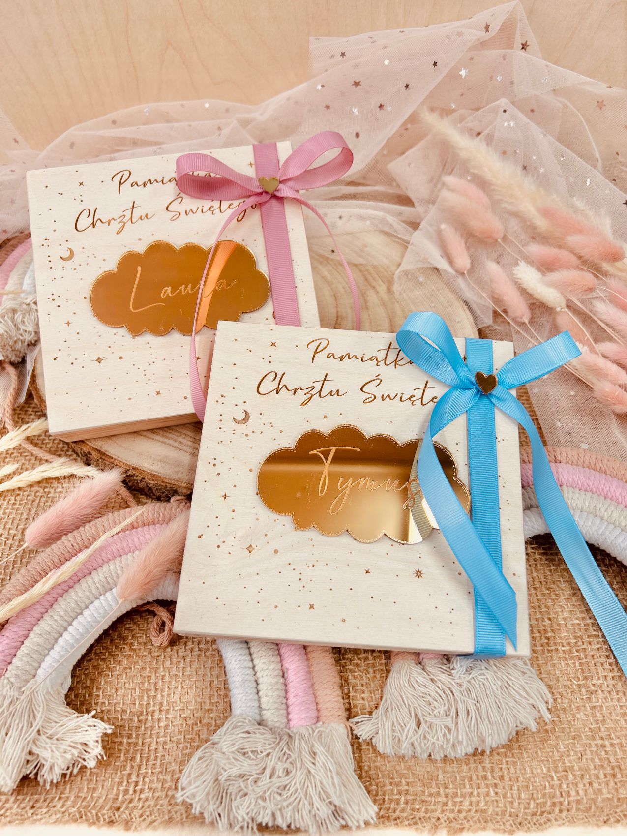 Pudełko zmieści banknoty, drobne upominki jak łańcuszki lub kolczyki, a wstążka dodaje uroku całości. Dodatkowo, wybór koloru wstążki (różowy lub niebieski) pozwala dopasować prezent do płci dziecka.