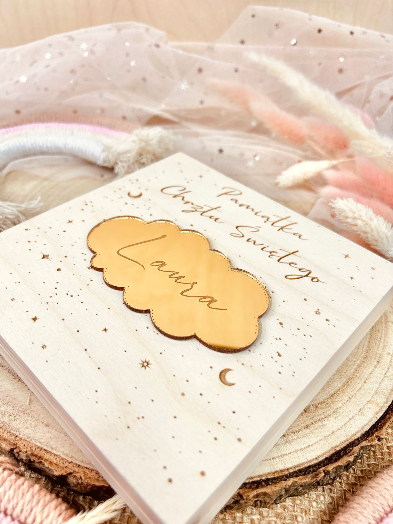 Drewniane pudełko myszka jako pamiątka Chrztu Świętego w formie pudełka to unikalny pomysł na prezent. Produkt wykonany jest z drewna oraz złotego lustra akrylowego. Pamiątka przygotowywana jest na indywidualne zamówienie. Jest to wyjątkowy prezent oraz piękna pamiątka dla dziecka.