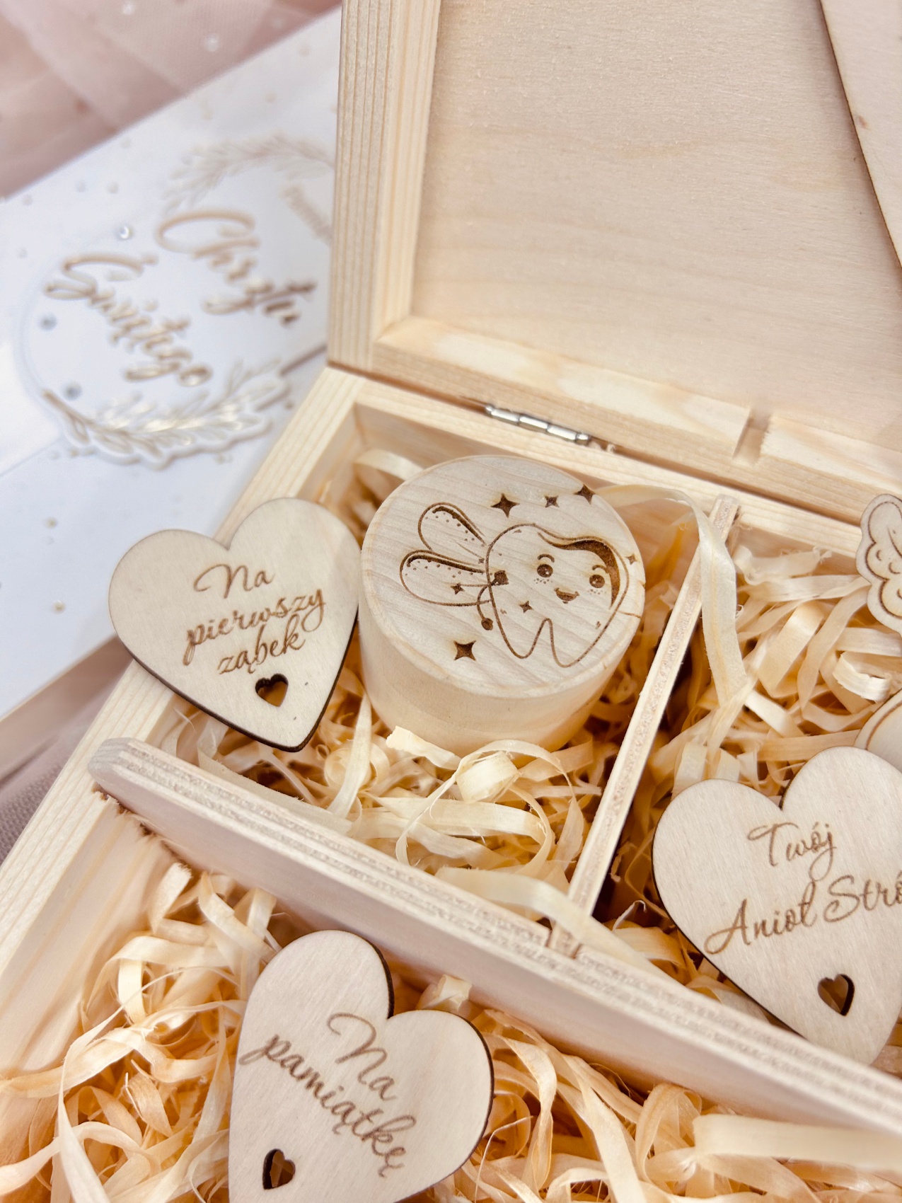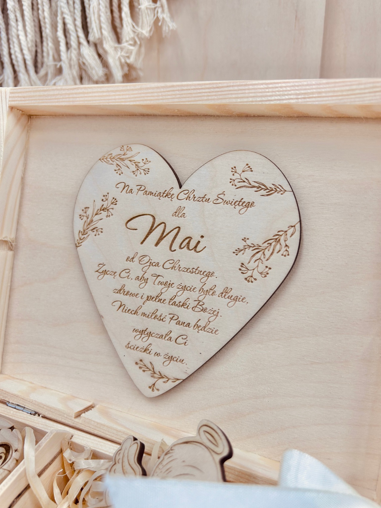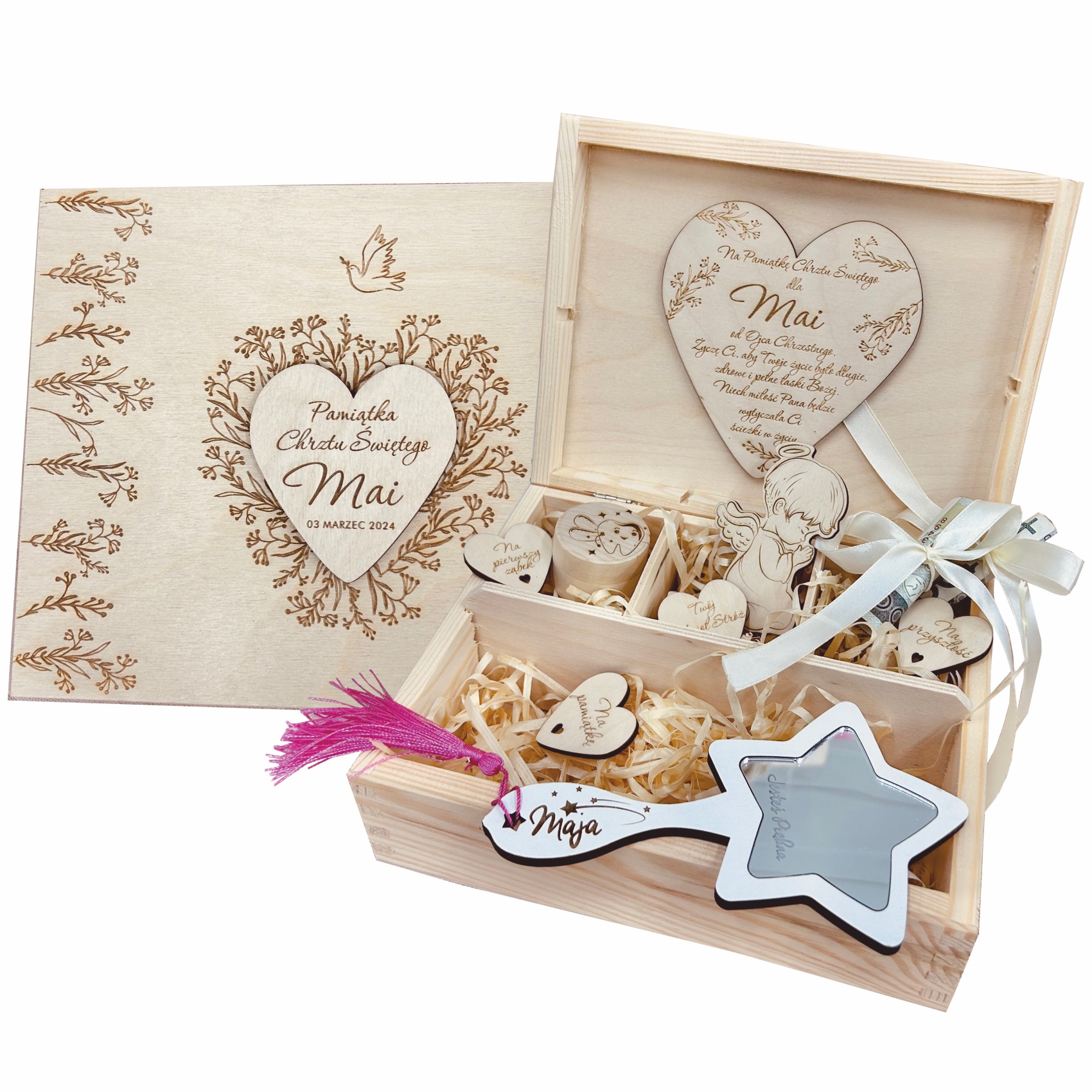 Personalizowane drewniane pudełko na Chrzest Święty z imieniem dziecka i datą uroczystości to wyjątkowy prezent, który stanie się niezapomnianą pamiątką. Produkt wykonany z drewna, z elementami ze sklejki w naturalnej kolorystyce, zapewnia elegancki i trwały wygląd. Pudełko zawiera specjalne przegródki z grawerowanymi serduszkami, które sprawiają, że każda część jest unikalna. Przegródki te symbolizują różne etapy życia dziecka, stanowiąc wyjątkową pamiątkę na przyszłość.