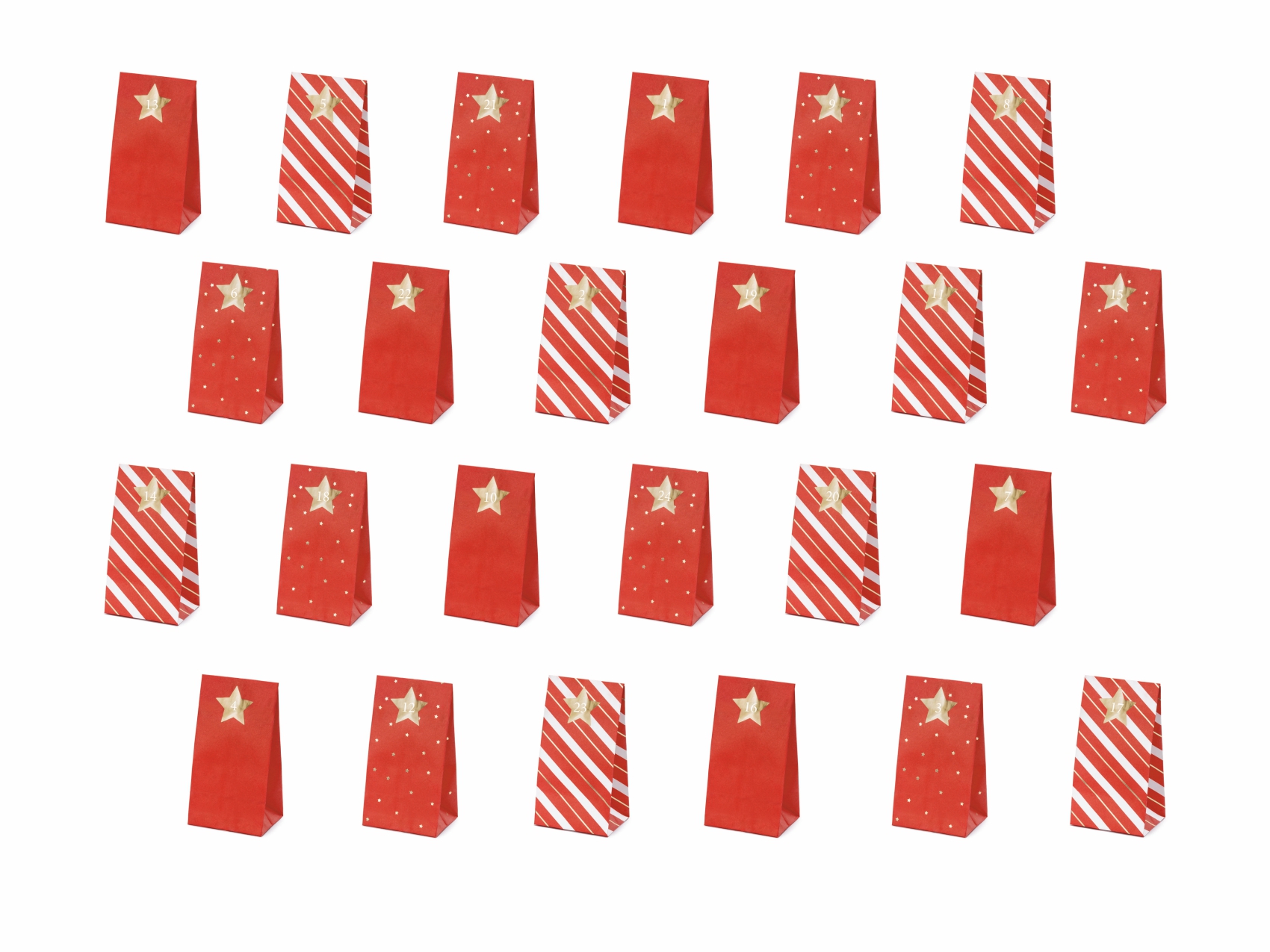 - 24 złote naklejki z białym nadrukiem numerów od 1 do 24. Wymiary torebek ok. 8 x 18 x 6.5 cm.