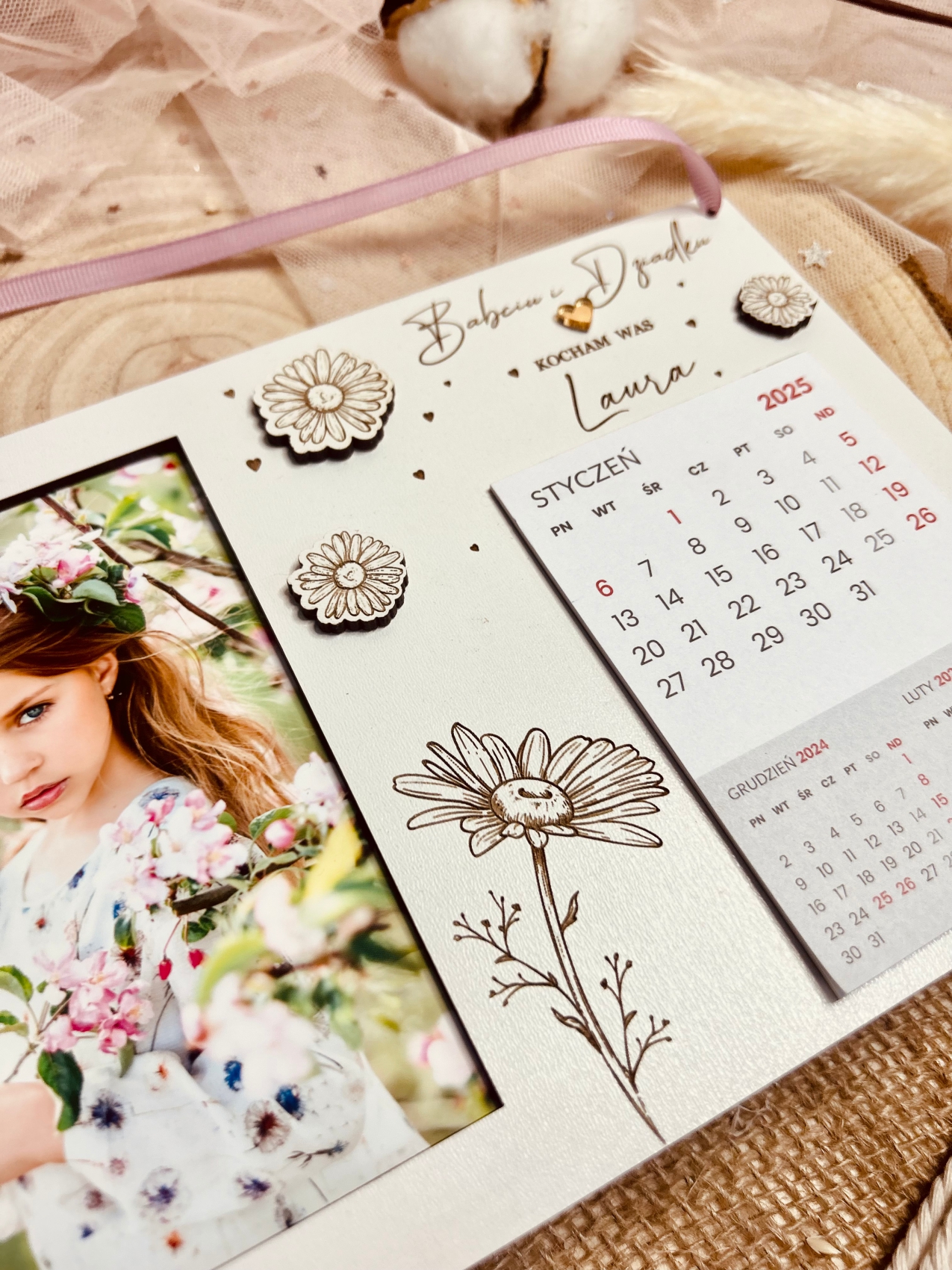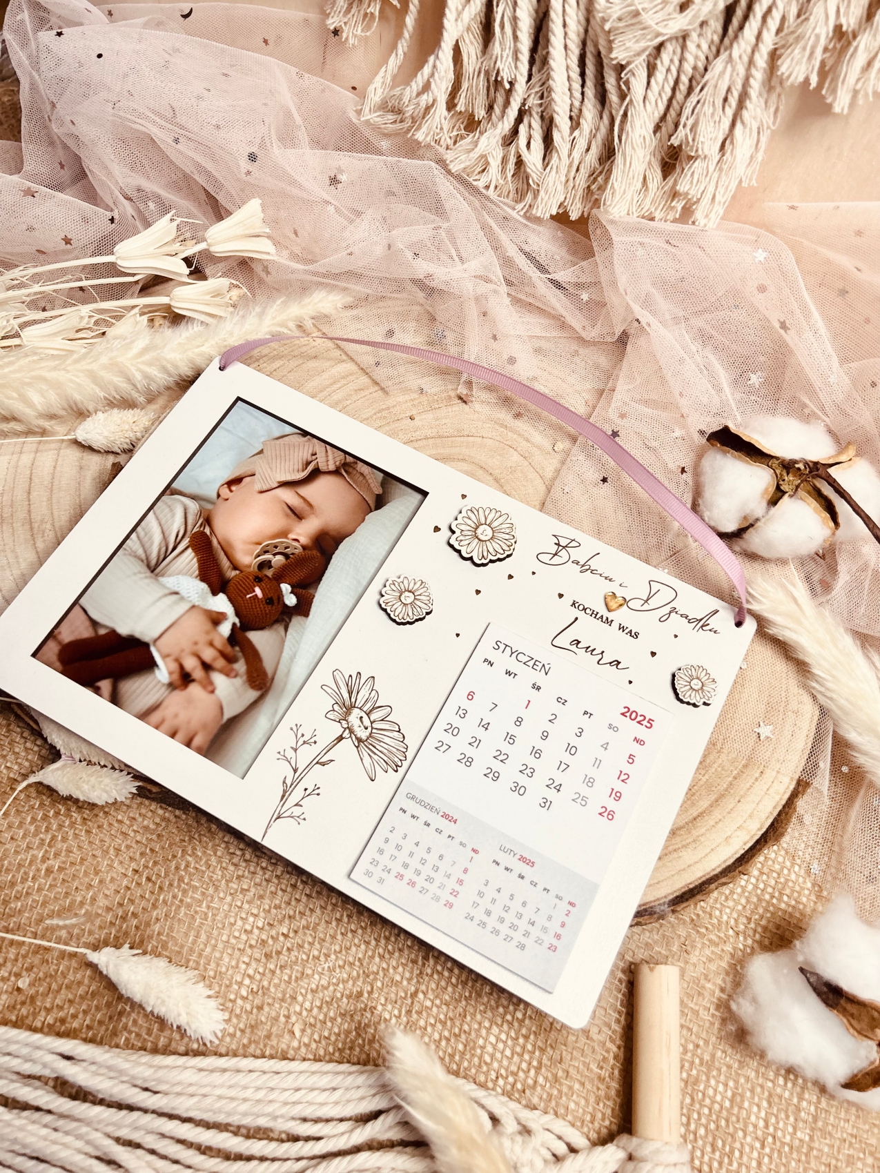 - Materiał: Kalendarz wykonany z białej płyty drewnopochodnej HDF, która jest trwała. Dekoracyjny element to przewiązana wstążka oraz papierowe kalendarium