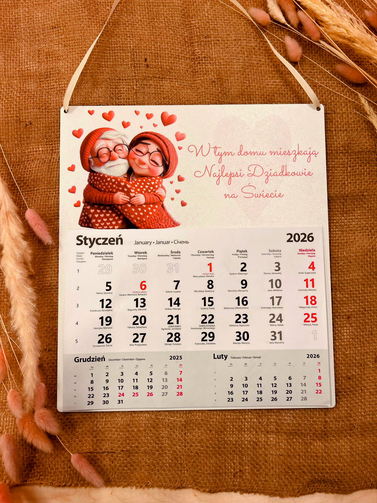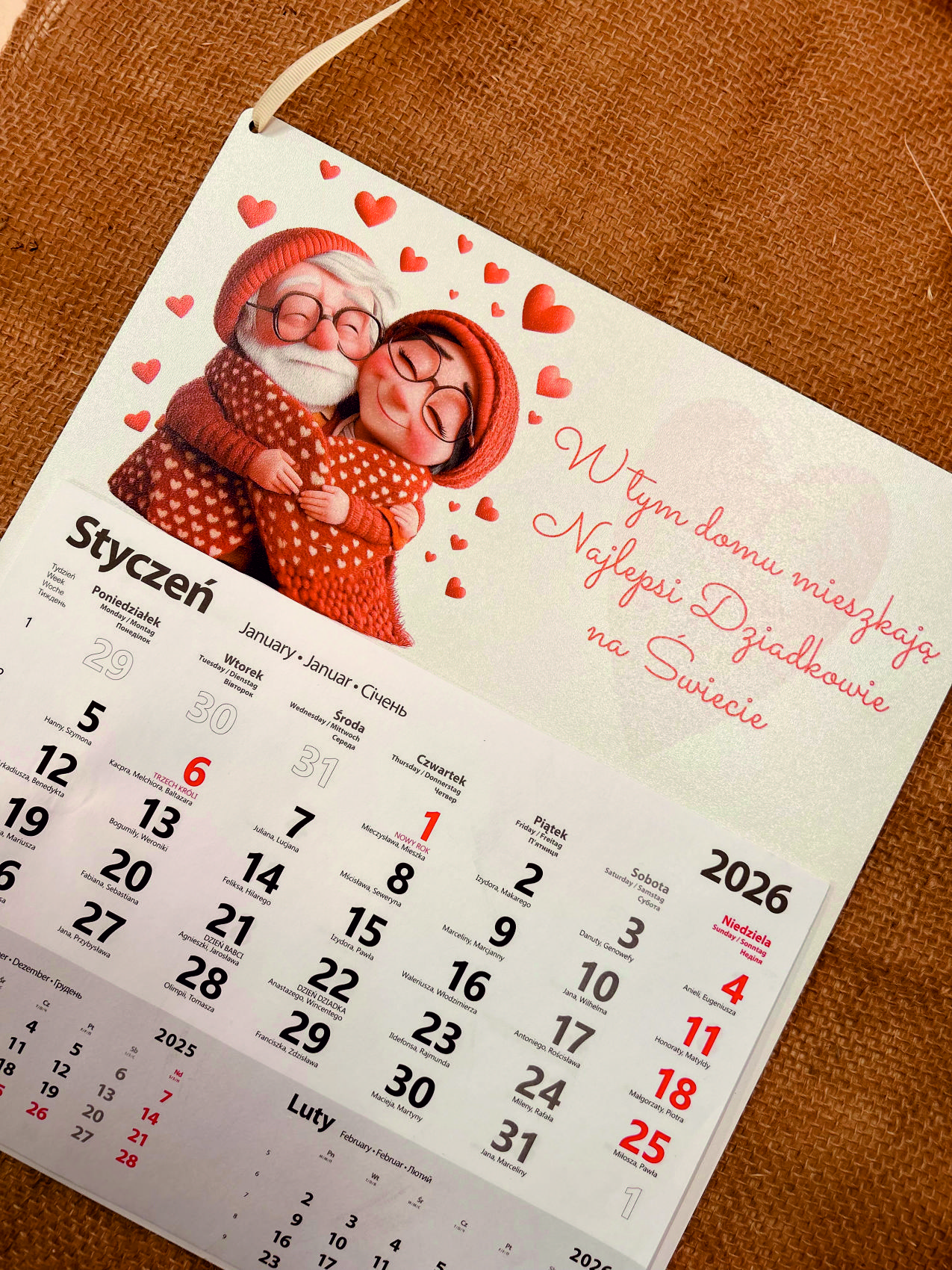 Wyjątkowy kalendarz z uroczą ilustracją dziadków. Idealny prezent na Dzień Babci i Dziadka. Wykonany z dbałością o detale, z wysokiej jakości nadrukiem UV, który zapewnia piękne, żywe kolory i trwałość.