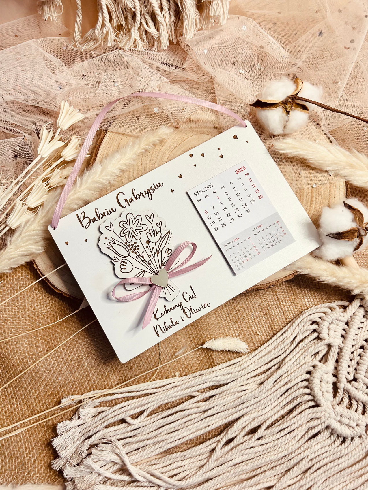 - Materiał: Kalendarz wykonany z białej płyty drewnopochodnej HDF, która jest trwała. Dekoracyjny element to przewiązana wstążka ze złotym lustrzanym serduszkiem, akrylowe złote lustro oraz papierowe kalendarium