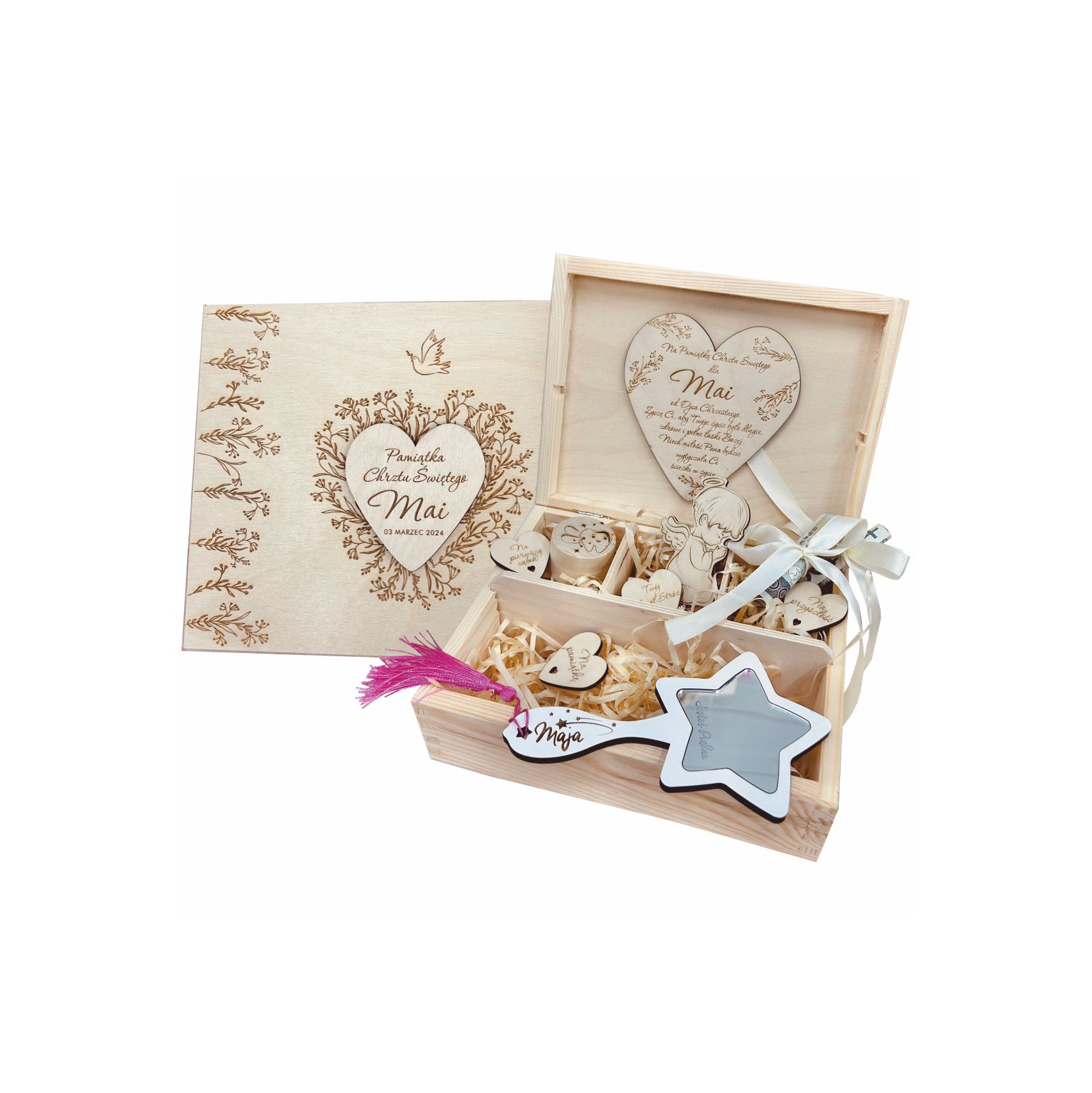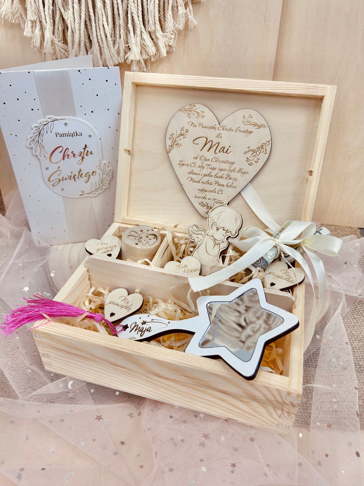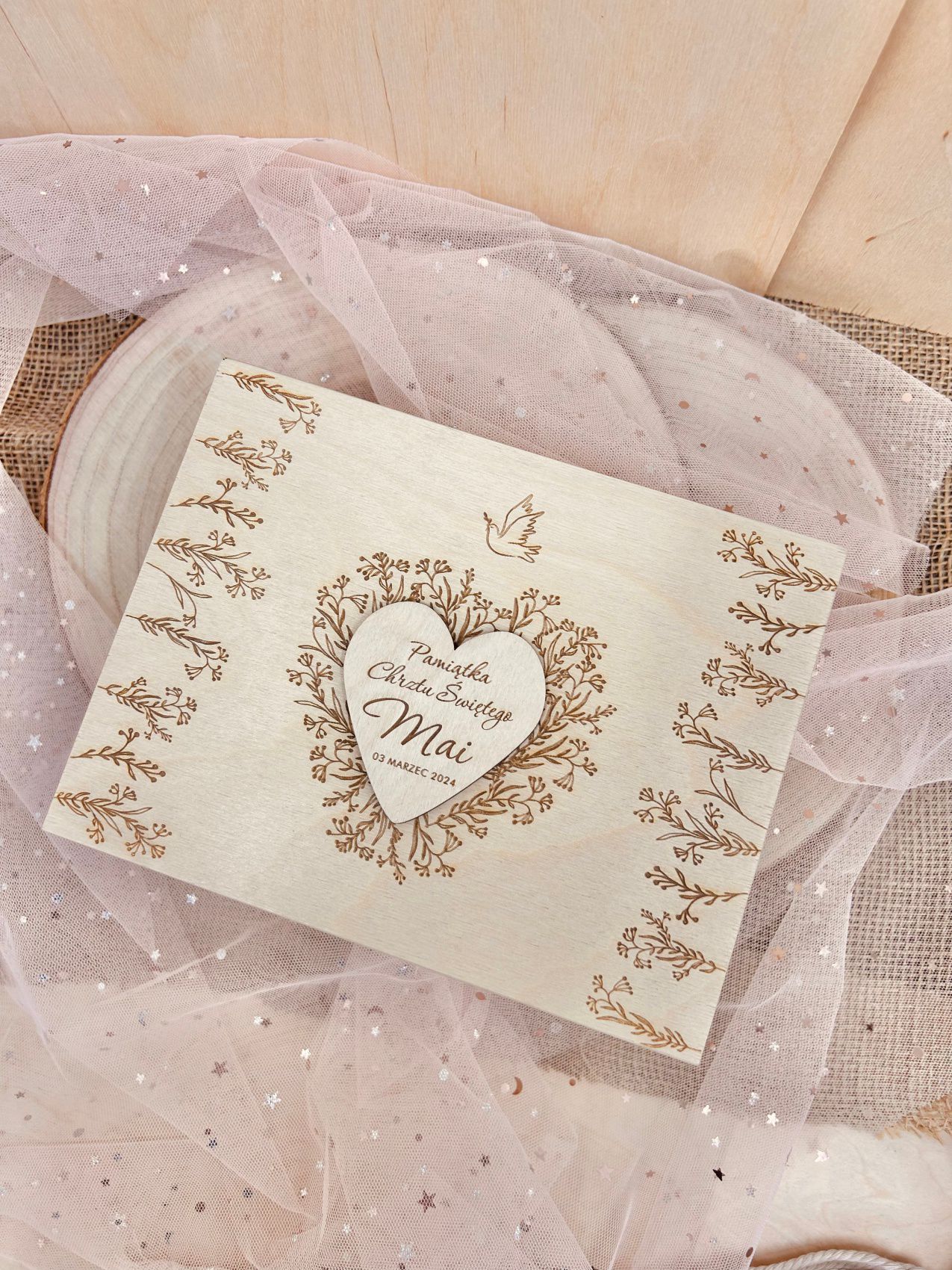 Pamiątka Chrztu Świętego w formie drewnianego pudełka to elegancka ozdoba, która zachowa wspomnienia na długie lata. Dzięki swojej personalizacji staje się wyjątkowym prezentem, który może być przekazywany z pokolenia na pokolenie. Idealna do przechowywania drobnych upominków, banknotów lub innych pamiątek związanych z tym wyjątkowym dniem. Z takim pudełkiem, Chrzest Święty stanie się jeszcze bardziej niezapomniany. Pamiątka pamiątka pamiątka pamiątka pamiątka