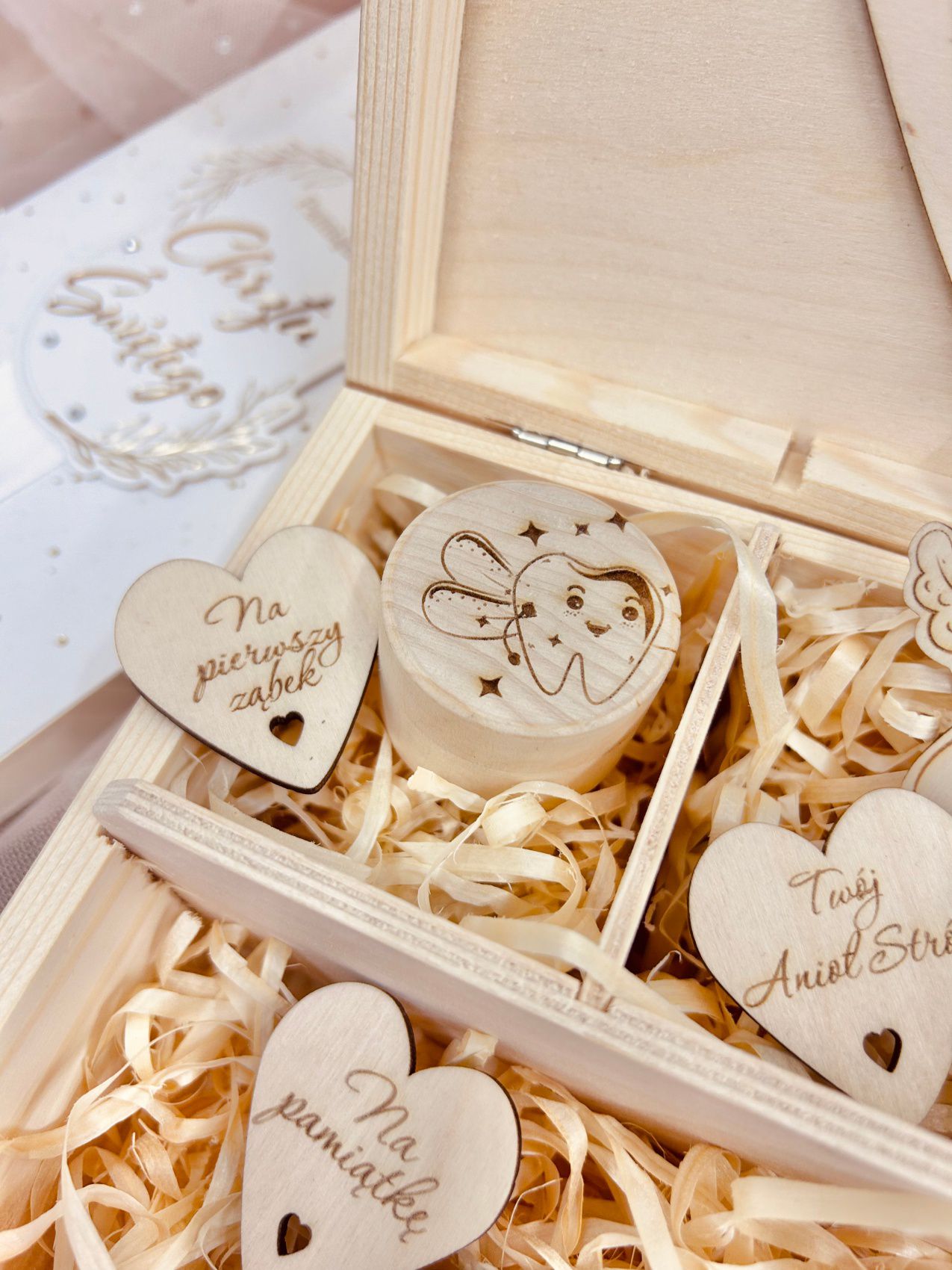 Niezbędnik z okazji Chrztu Świętego to personalizowane drewniane pudełko z imieniem dziecka i datą uroczystości. To wyjątkowy prezent, który stanie się niezapomnianą pamiątką. Produkt wykonany z drewna, z elementami ze sklejki w naturalnej kolorystyce, zapewnia elegancki i trwały wygląd. Pudełko zawiera specjalne przegródki z grawerowanymi serduszkami, które sprawiają, że każda część jest unikalna. Przegródki te symbolizują różne etapy życia dziecka, stanowiąc wyjątkową pamiątkę na przyszłość.