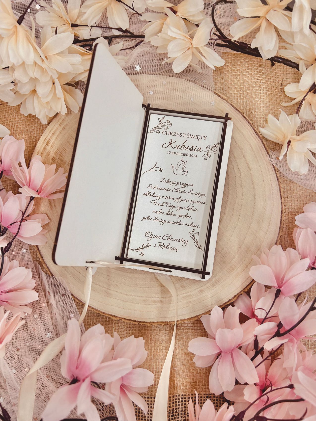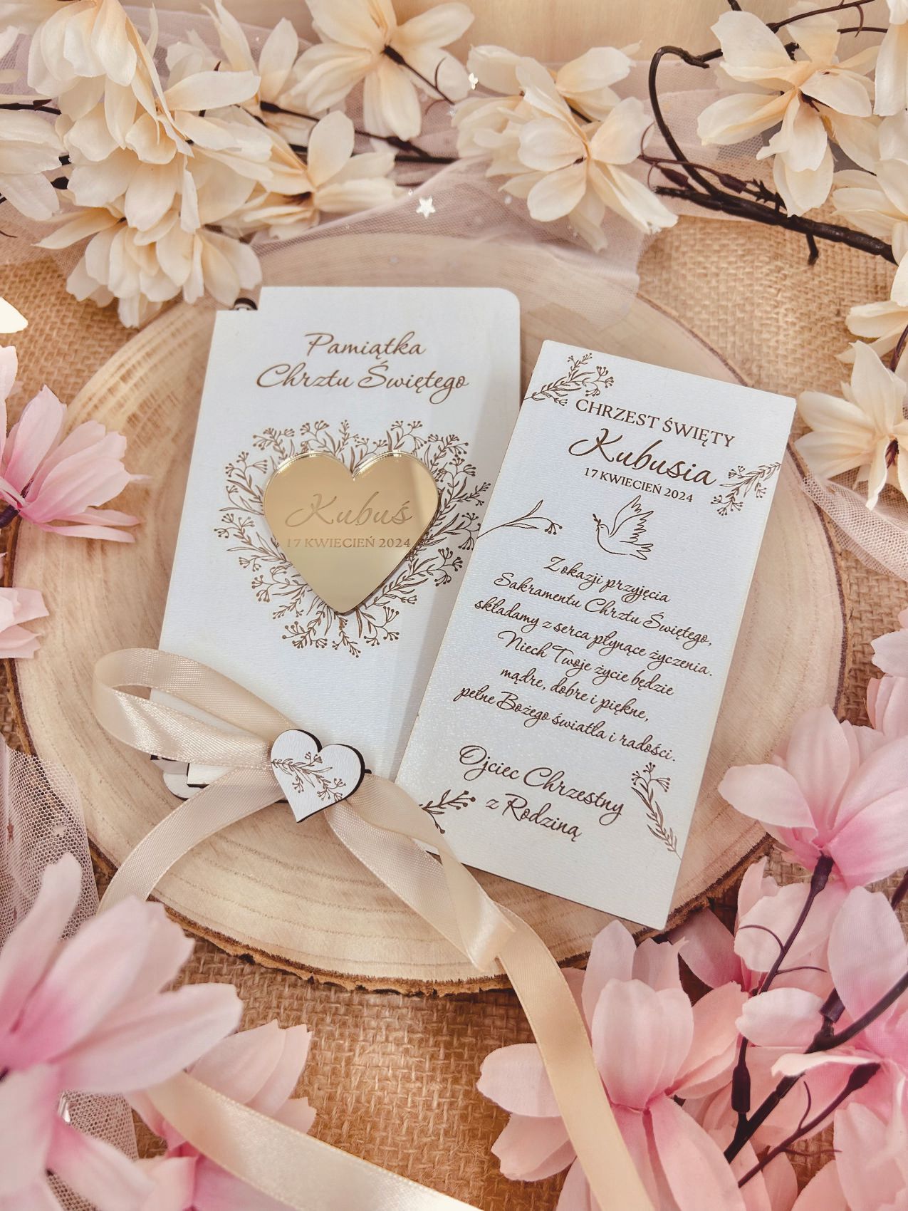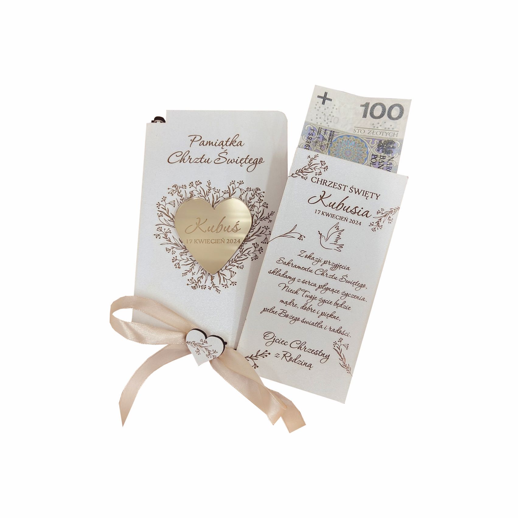 Personalizowane pudełko na pieniądze w formie pudełka z sercem to doskonały wybór, gdy szukasz wyjątkowego prezentu na Chrzest Święty. Jego elegancka forma łączy białą płytę drewnopochodną z złotym akrylowym lustrem, co nadaje mu niepowtarzalnego charakteru. To nie tylko praktyczny sposób na wręczenie pieniędzy, ale także piękna pamiątka na lata.