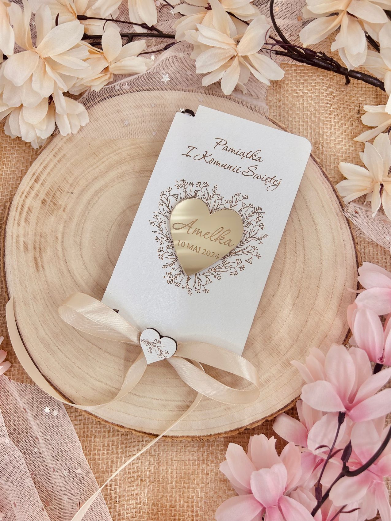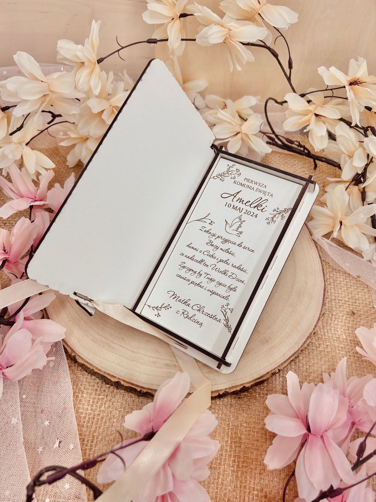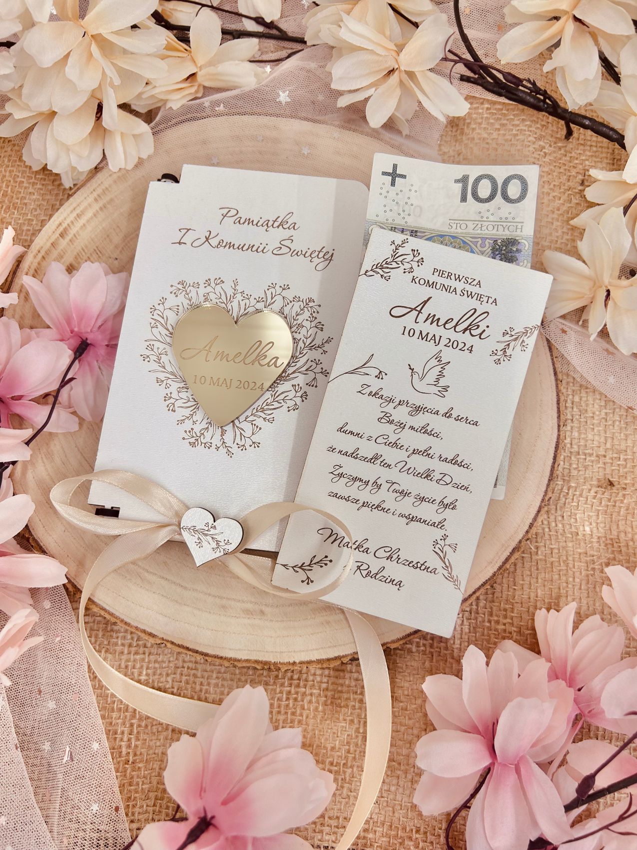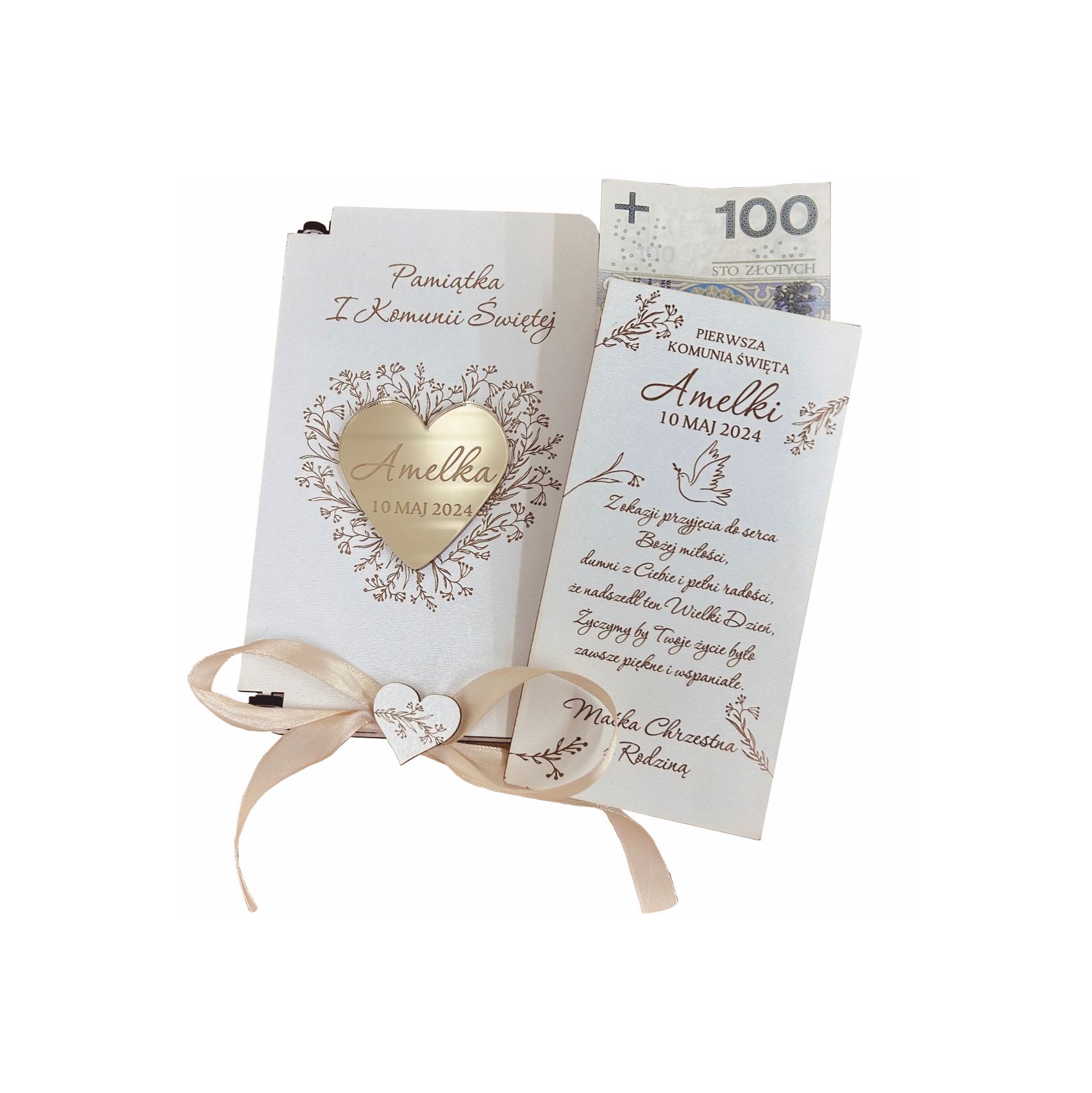 Wnętrze pudełka zaprojektowaliśmy tak, aby bez problemu pomieściło banknoty, a także biżuterię, medalik czy inne drobne upominki, dzięki czemu prezent pozostaje funkcjonalny oraz uniwersalny. Do zestawu dołączamy elegancką wstążkę z serduszkiem, która nie tylko zdobi całość, ale również podkreśla uroczysty charakter okazji.