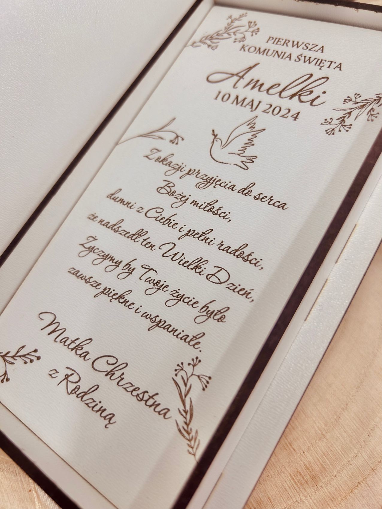 Ponieważ przygotowujemy każdy egzemplarz na indywidualne zamówienie, możesz w pełni spersonalizować zarówno imię dziecka, jak i datę uroczystości. Grawerujemy wybrane informacje, dzięki czemu prezent zyskuje osobisty charakter, a zarazem staje się unikalną pamiątką na lata. Co więcej, dodajemy życzenia oraz podpis osoby wręczającej, dlatego całość nabiera jeszcze bardziej emocjonalnego i sentymentalnego wymiaru. Dbamy o każdy detal, aby efekt końcowy był spójny, estetyczny oraz dopracowany.