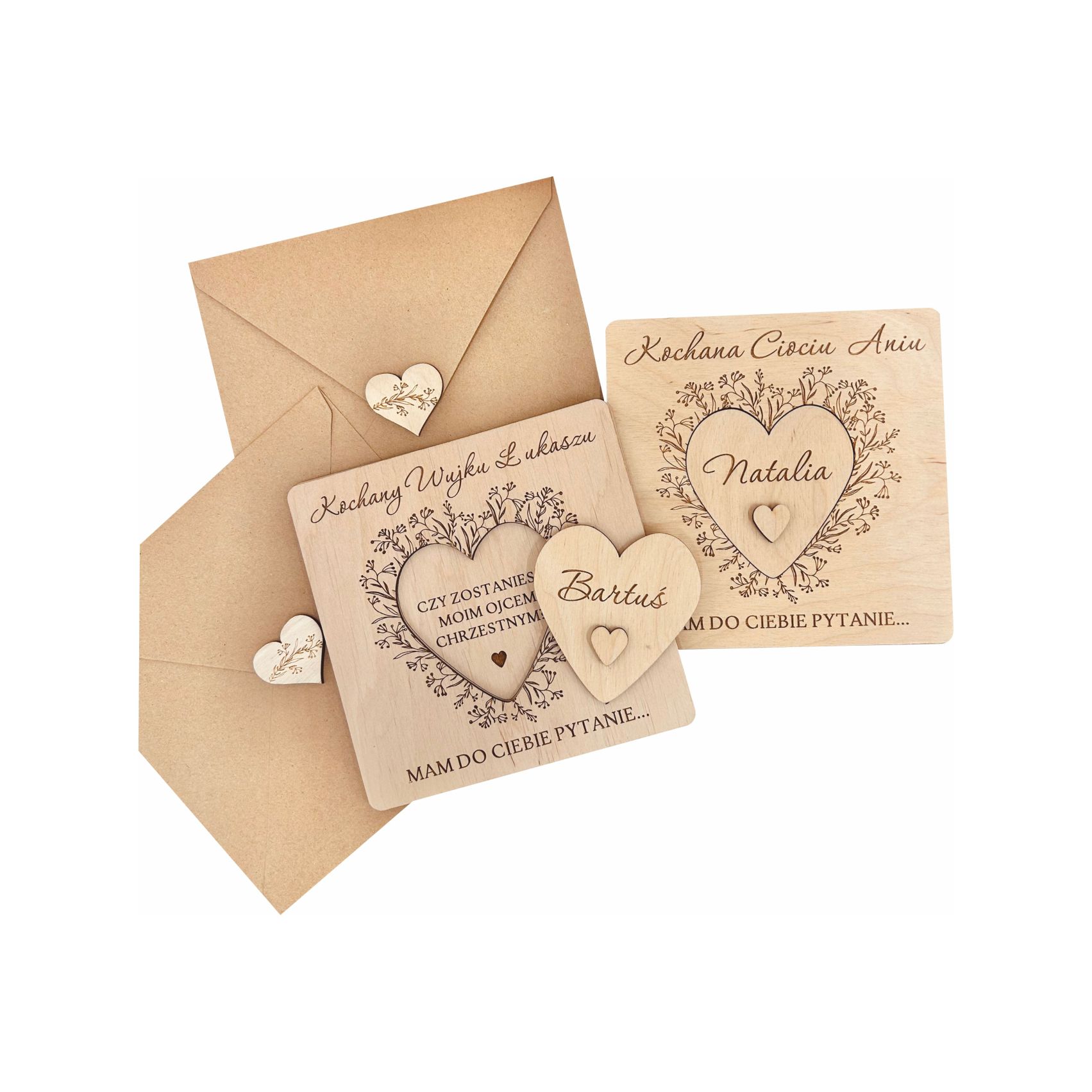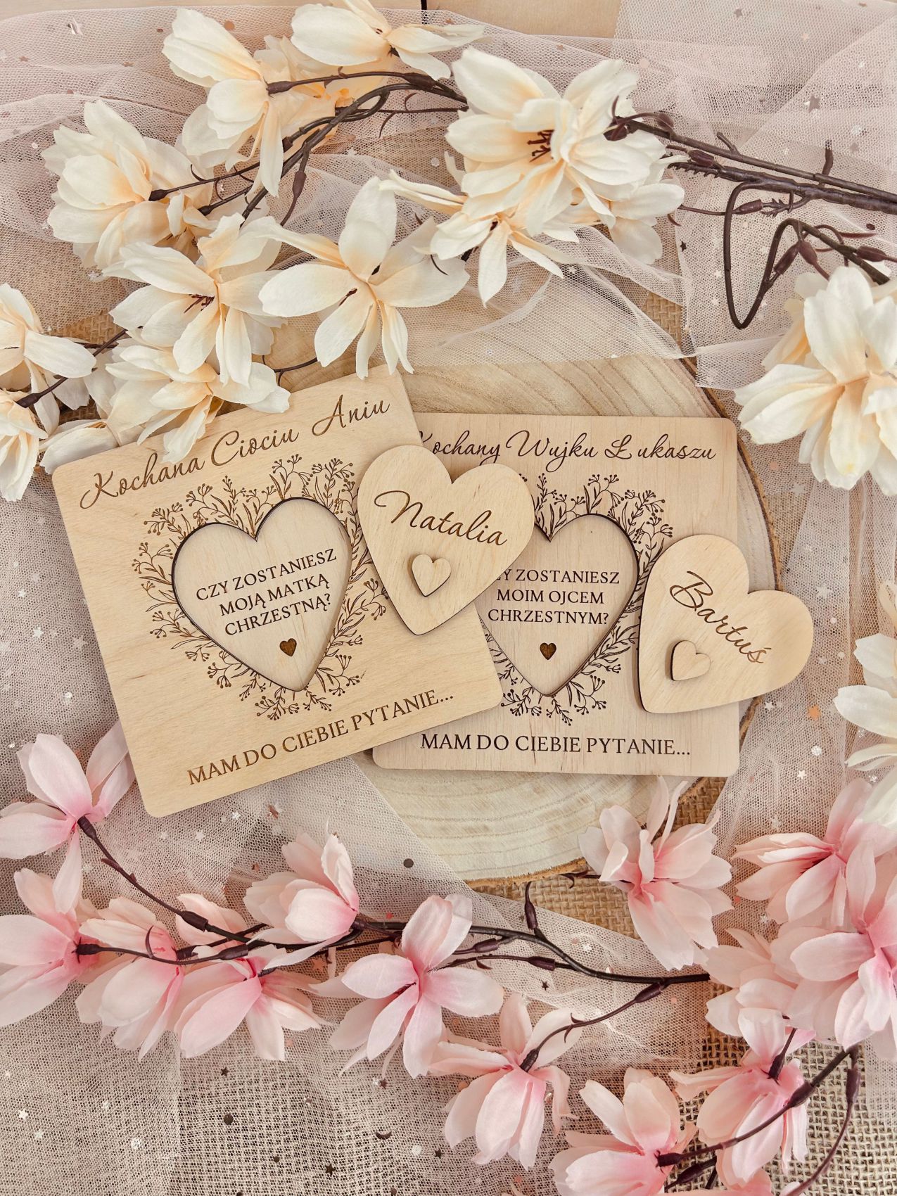 Prośby o bycie Chrzestnym z sercem jako personalizowane zaproszenie Rodziców Chrzestnych. Produkt wykonany jest z sklejki. Zaproszenie przygotowywane jest na indywidualne zamówienie. Jest to wyjątkowy prezent oraz piękna pamiątka.