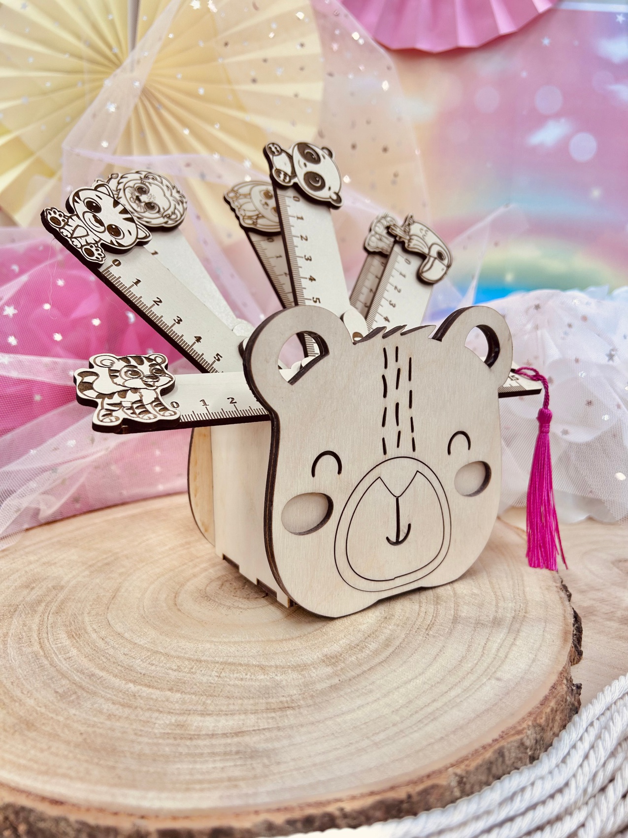 Przybornik charakteryzuje się eleganckim designem, przypominającym sympatycznego misia. Jest to produkt tworzony na indywidualne zamówienie, co daje możliwość personalizacji. Grawerowanie wykonane za pomocą najwyższej jakości lasera zapewnia trwałość i precyzyjność detali, dzięki czemu każda sztuka jest unikalna.