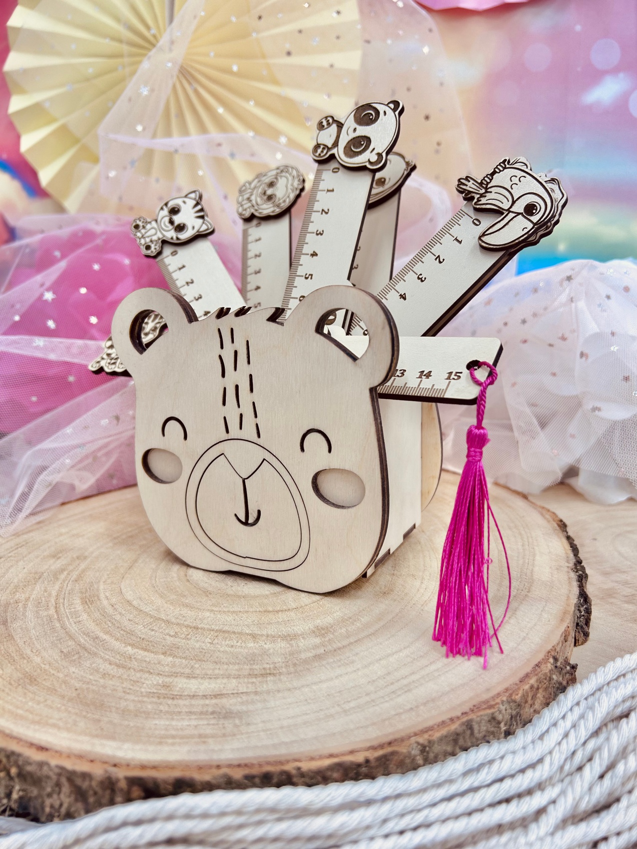 Organizer na biurko w kształcie misia. Jest to produkt wyjątkowy, wykonany ze szczególną starannością. Praktyczny oraz wyjątkowy, tworzony na indywidualne zamówienie. Przybornik posiada możliwość personalizacji.