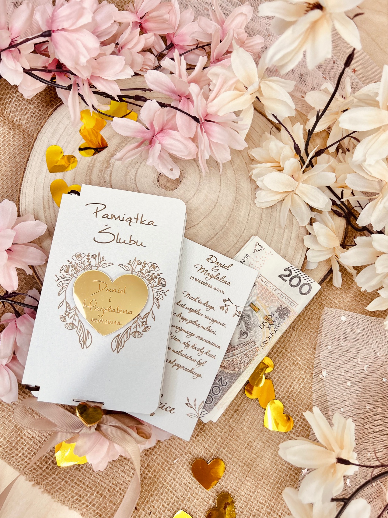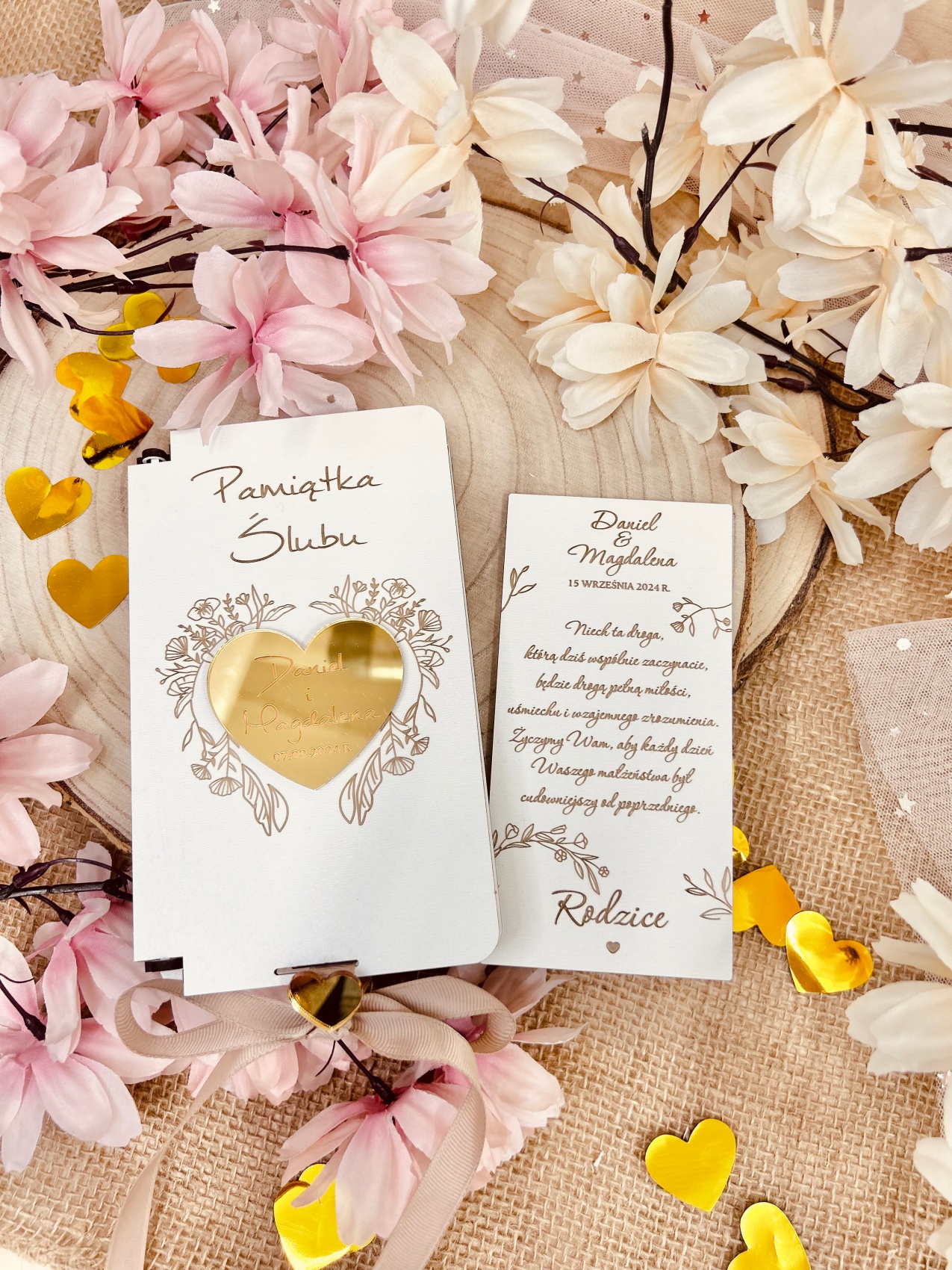 - Personalizowane pudełko oraz wstążka ze złotym serduszkiem
