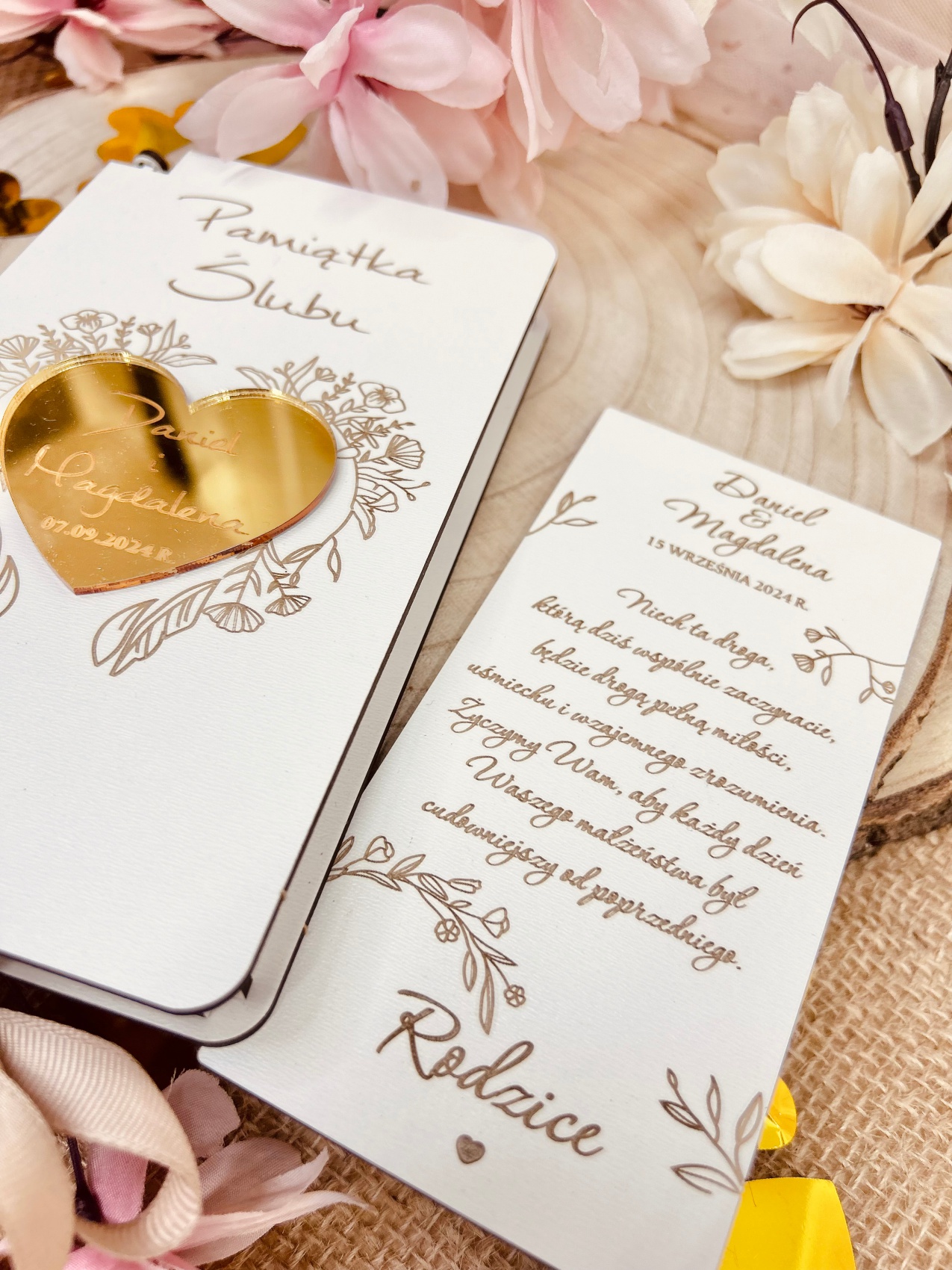 Pamiątka w formie pudełka to unikalny pomysł na prezent. Produkt wykonany jest z białej płyty drewnopochodnej oraz złotego lustra akrylowego. Pamiątka przygotowywana jest na indywidualne zamówienie. Jest to wyjątkowy prezent oraz piękna pamiątka dla Pary Młodej.