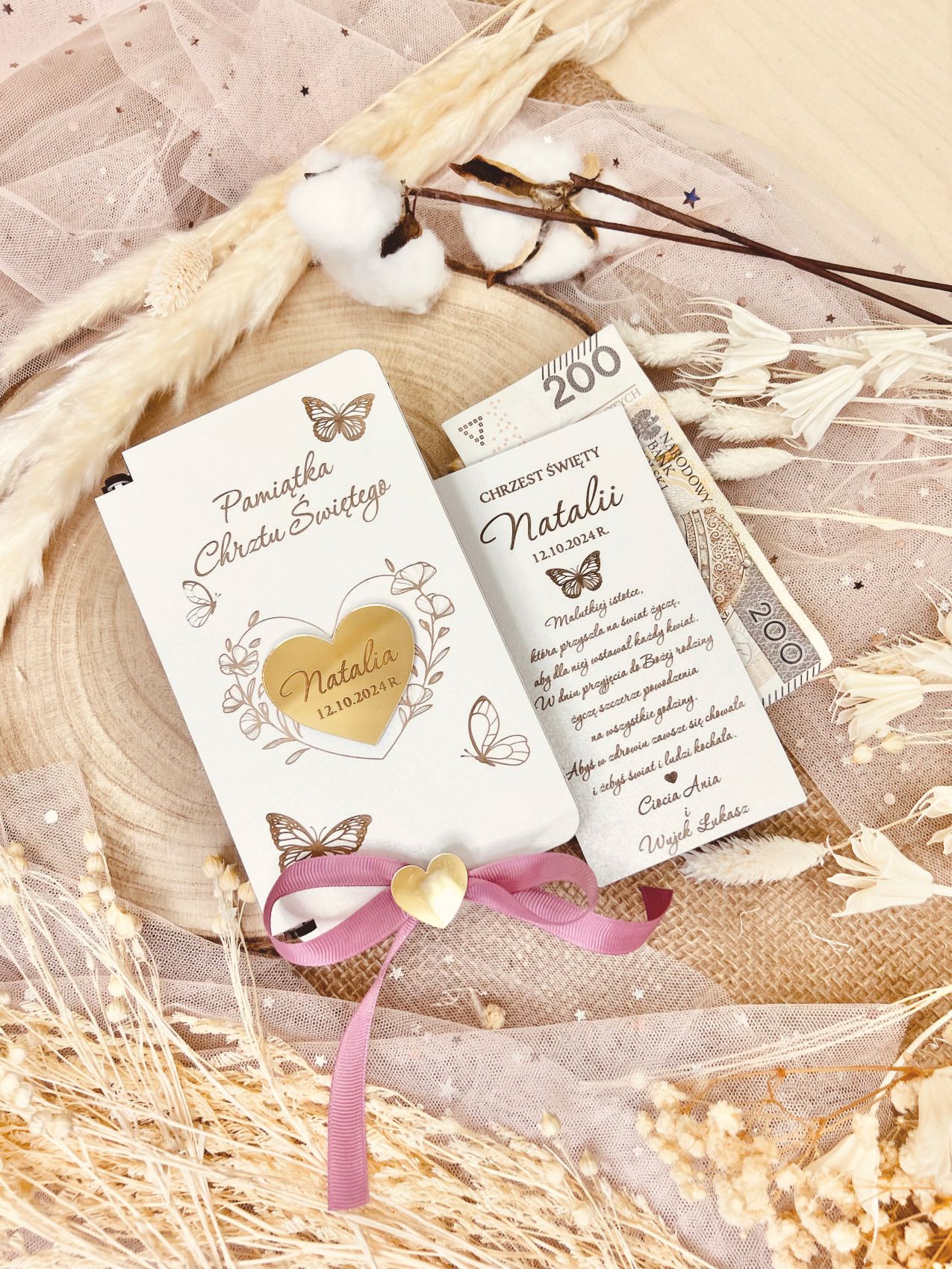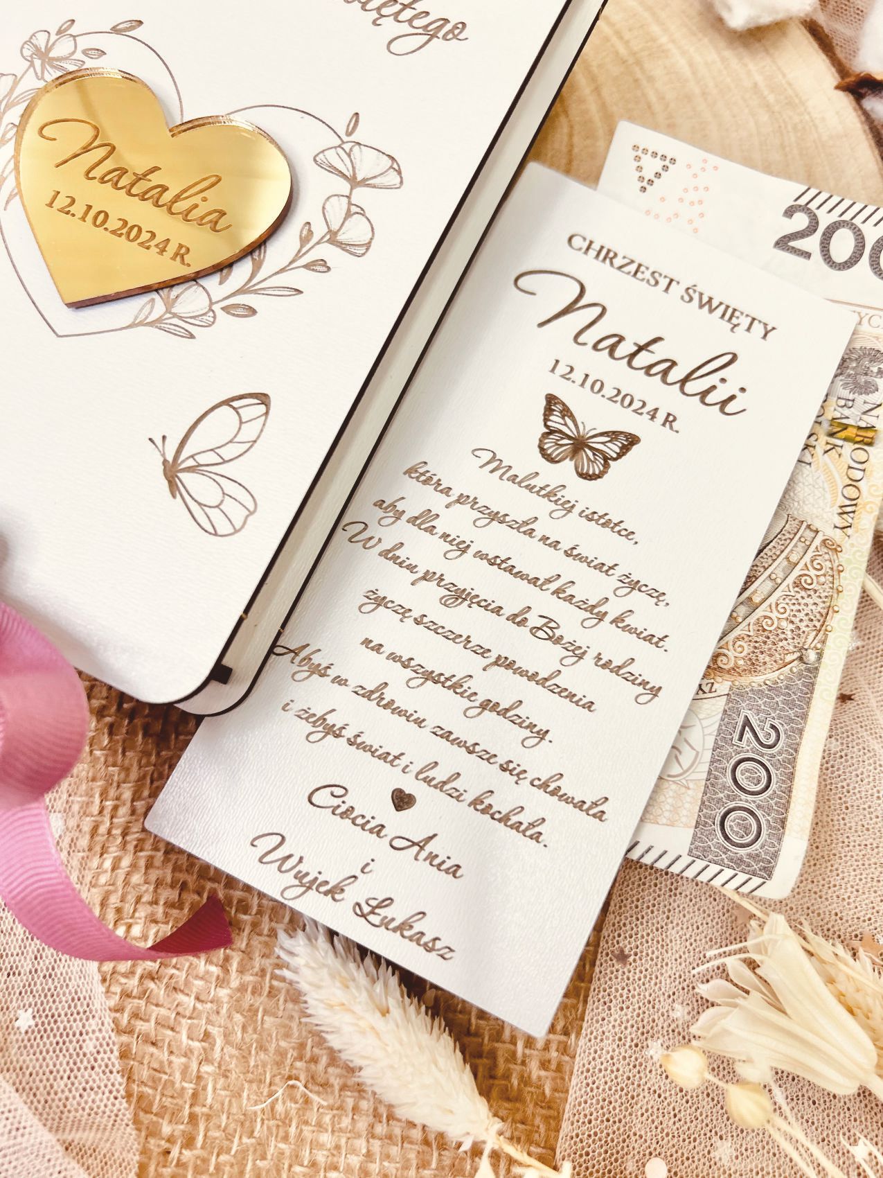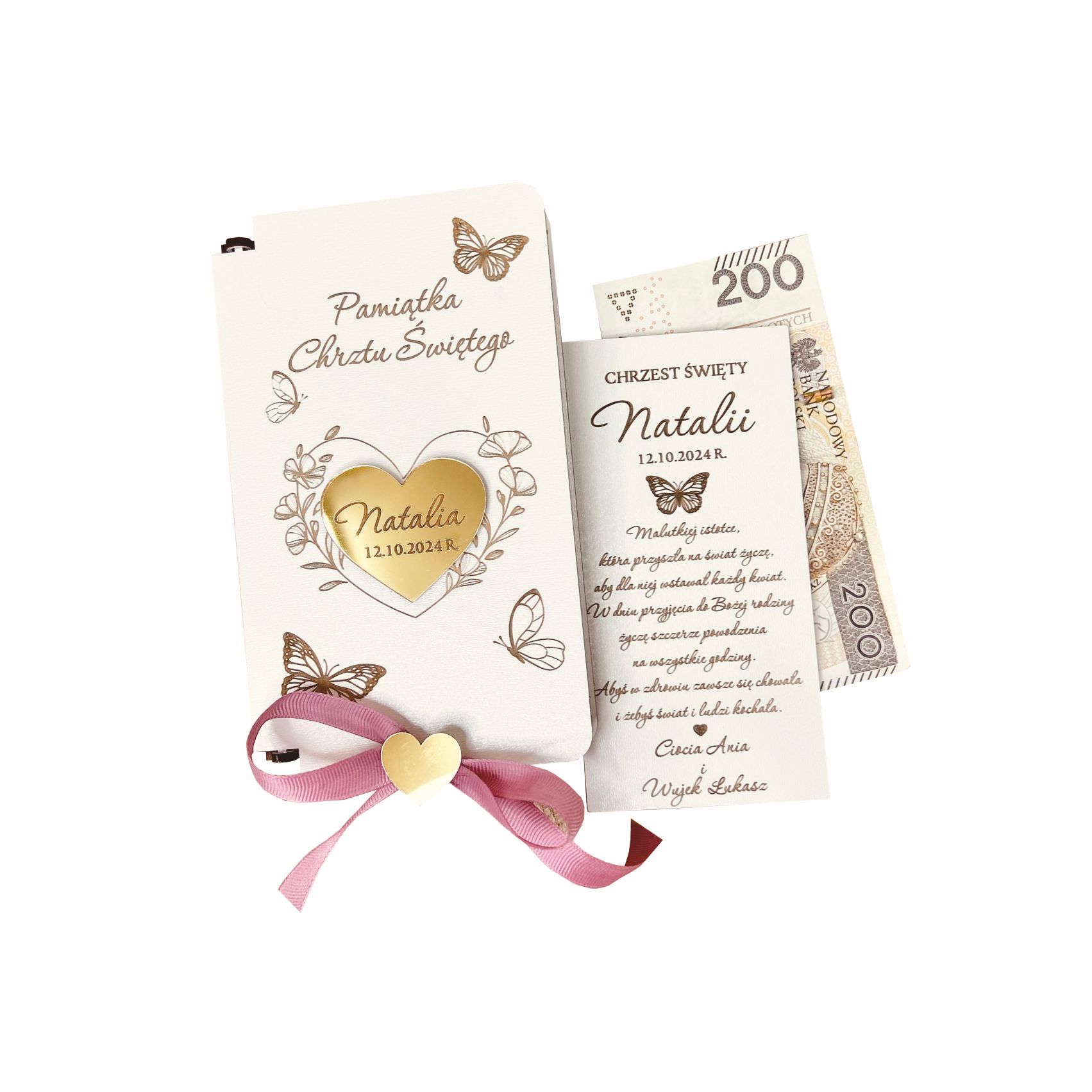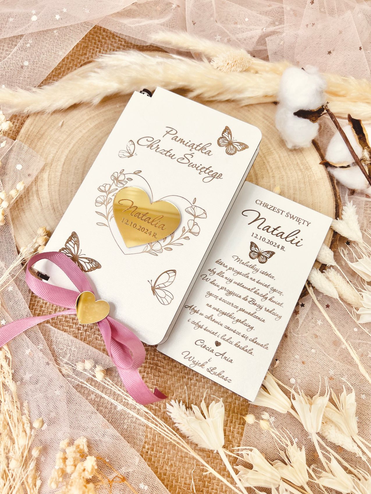 - Personalizowane pudełko z motylkiem oraz wstążka z serduszkiem
