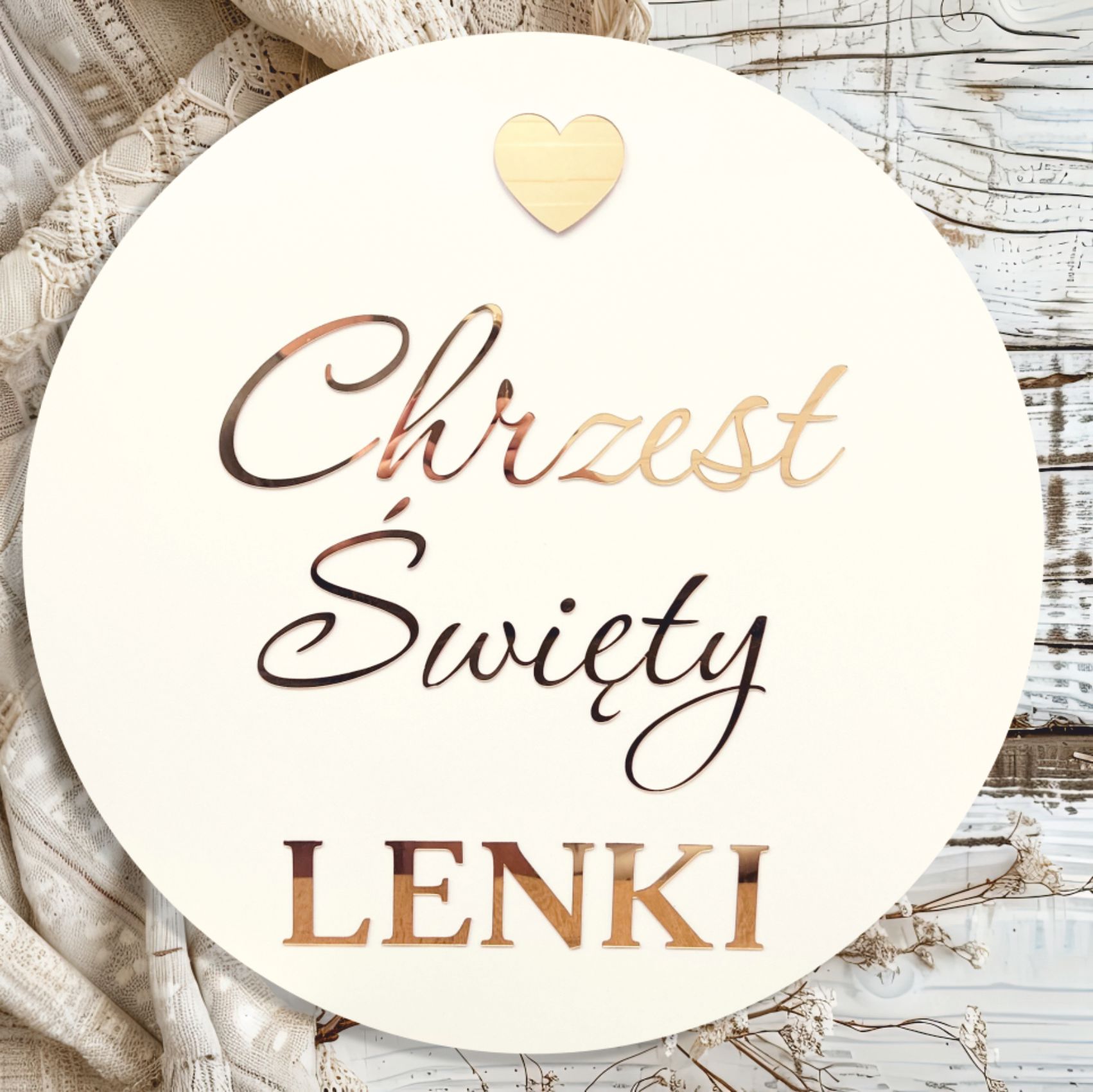 Tablica dekoracyjna z okazji Chrztu Świętego wykonana z białej płyty drewnopochodnej oraz ze złotego lustra akrylowego. Tablica w kształcie koła o średnicy 50 cm.