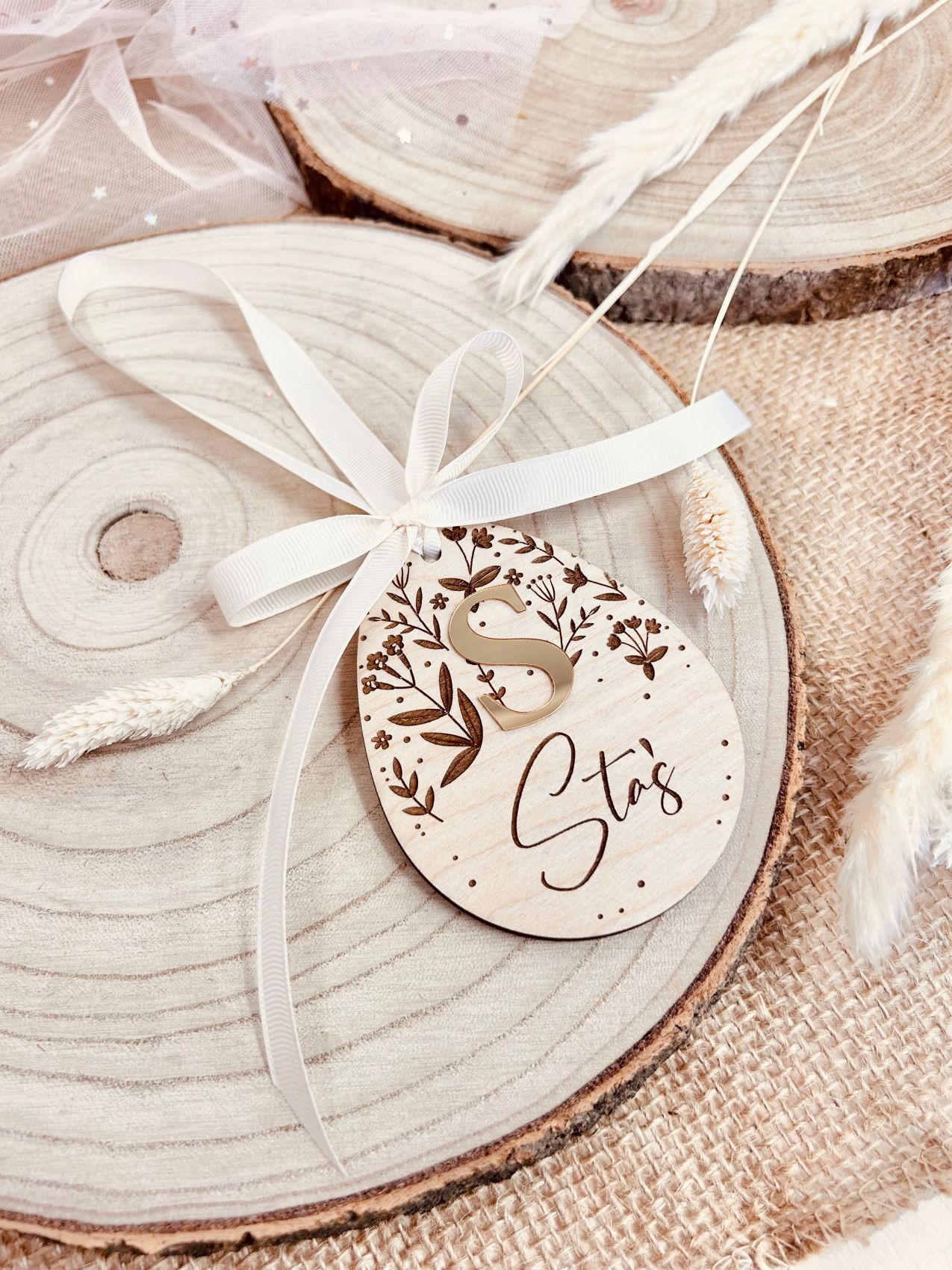 Zawieszka z złotą literką w kształcie jajka, wykonana z wysokiej jakości drewna, to wyjątkowy produkt, który z pewnością przyciągnie uwagę. Dzięki precyzyjnemu grawerowi, na zawieszce widnieje imię oraz pierwsza litera imienia, która została wyróżniona złotym akcentem, co dodaje elegancji i unikalności.