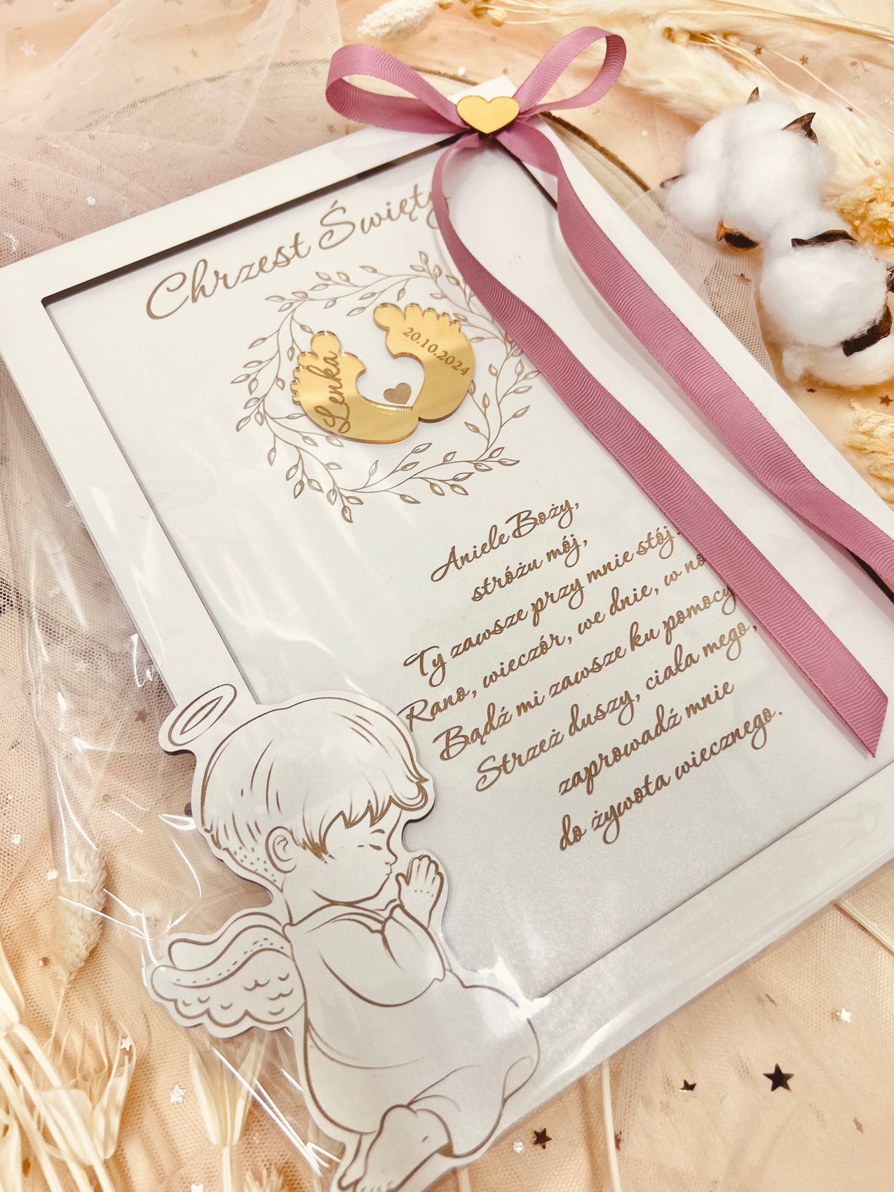 Obrazek Pamiątka Chrztu Świętego z imieniem dziecka oraz datą uroczystości. Obrazek można powiesić, posiada z tyłu otwory do powieszenia.