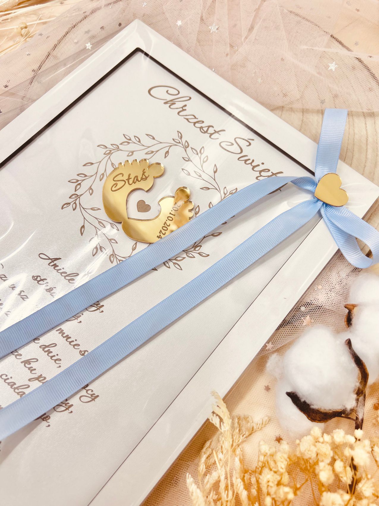 Zestaw pamiątek z stópkami na Chrzest Święty w formie drewnianego pudełka i obrazka to unikalny pomysł na prezent. Produkt wykonany jest z białej płyty oraz złotego lustra akrylowego. Pamiątka przygotowywana jest na indywidualne zamówienie. Jest to wyjątkowy prezent oraz piękna pamiątka dla dziecka.