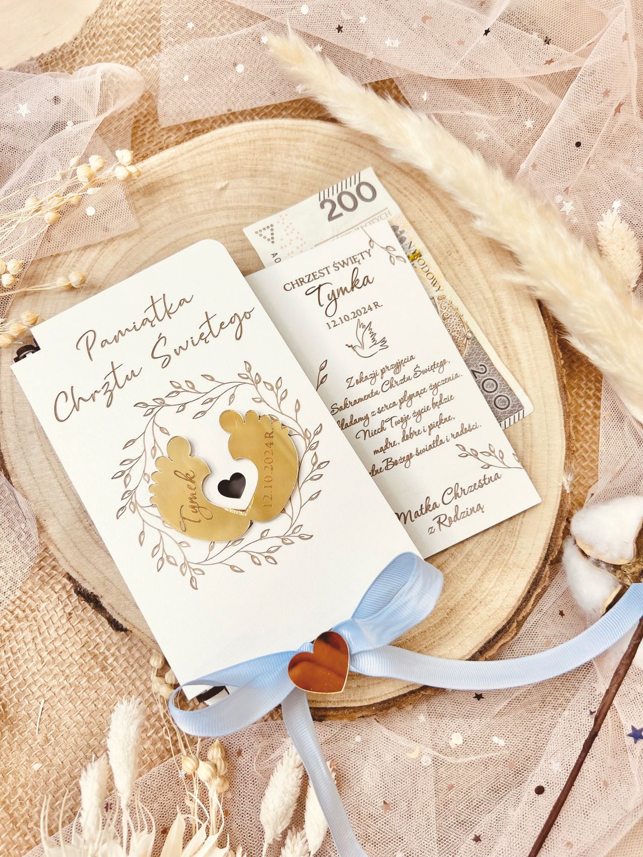 Zestaw pamiątek z stópkami na Chrzest Święty zawiera :