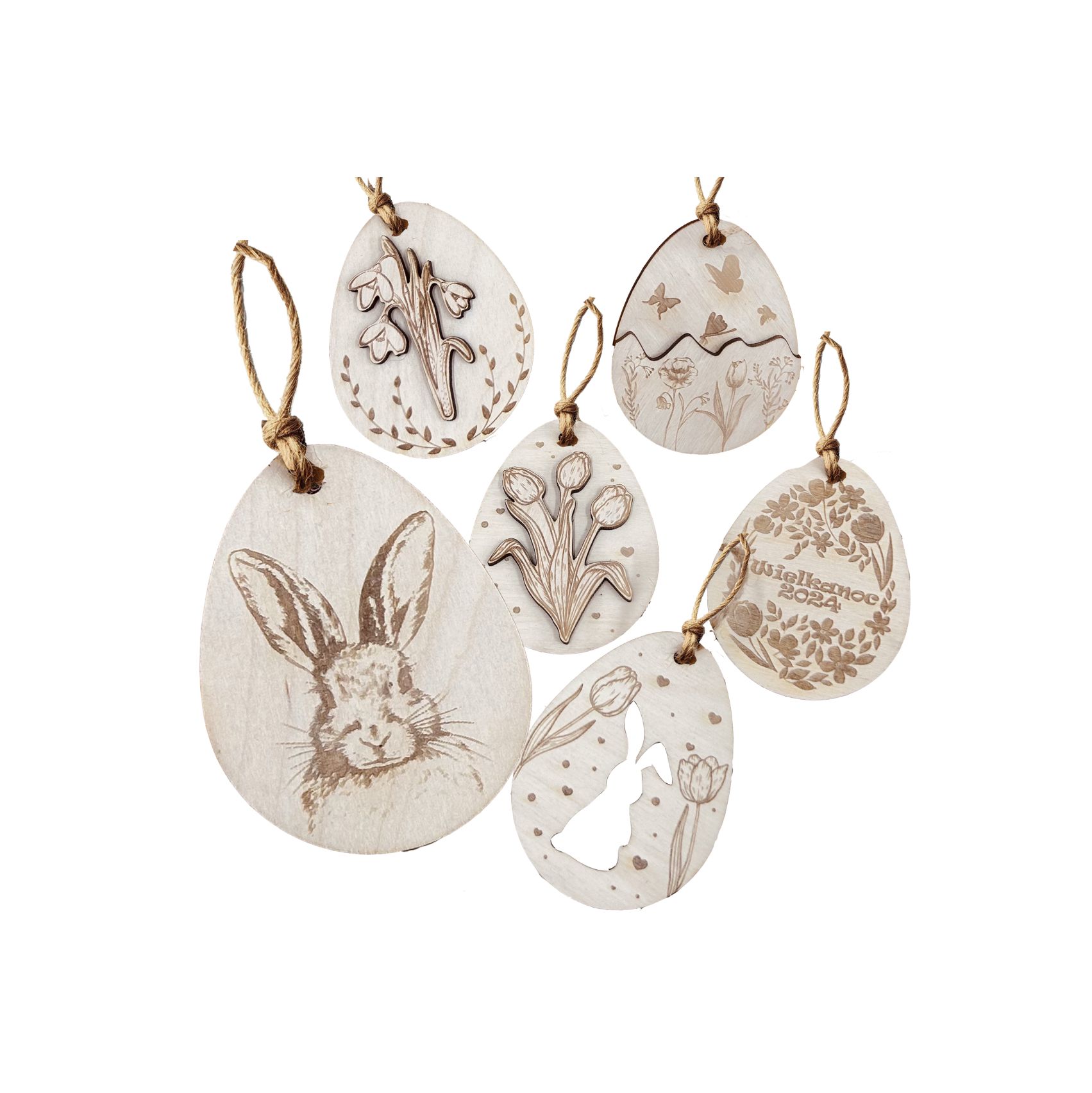 Zestaw Pisanek Wielkanocnych w kształcie jajek. Zestaw składa się z 6 szt. Materiał z jakiego zostały wykonane dekoracje to wysokiej jakości sklejka brzozowa.